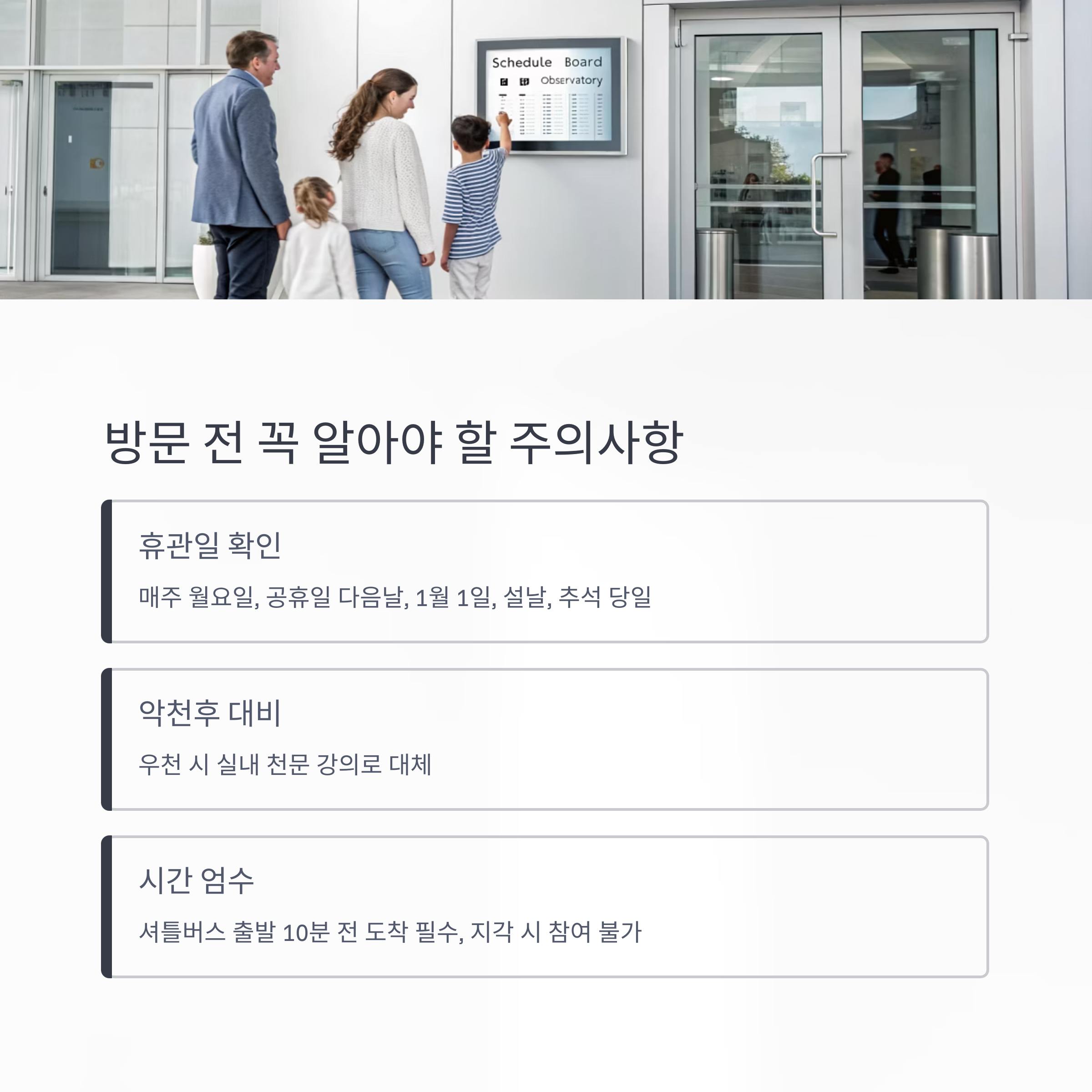 날씨도 미리 체크해 보세요. 우천 시에는 프로그램이 변경되니까 일기예보를 확인하고 방문하시면 좋아요. 흐린 날에는 별 관측이 어려울 수 있으니까 맑은 날을 노리시는 게 좋아요.
