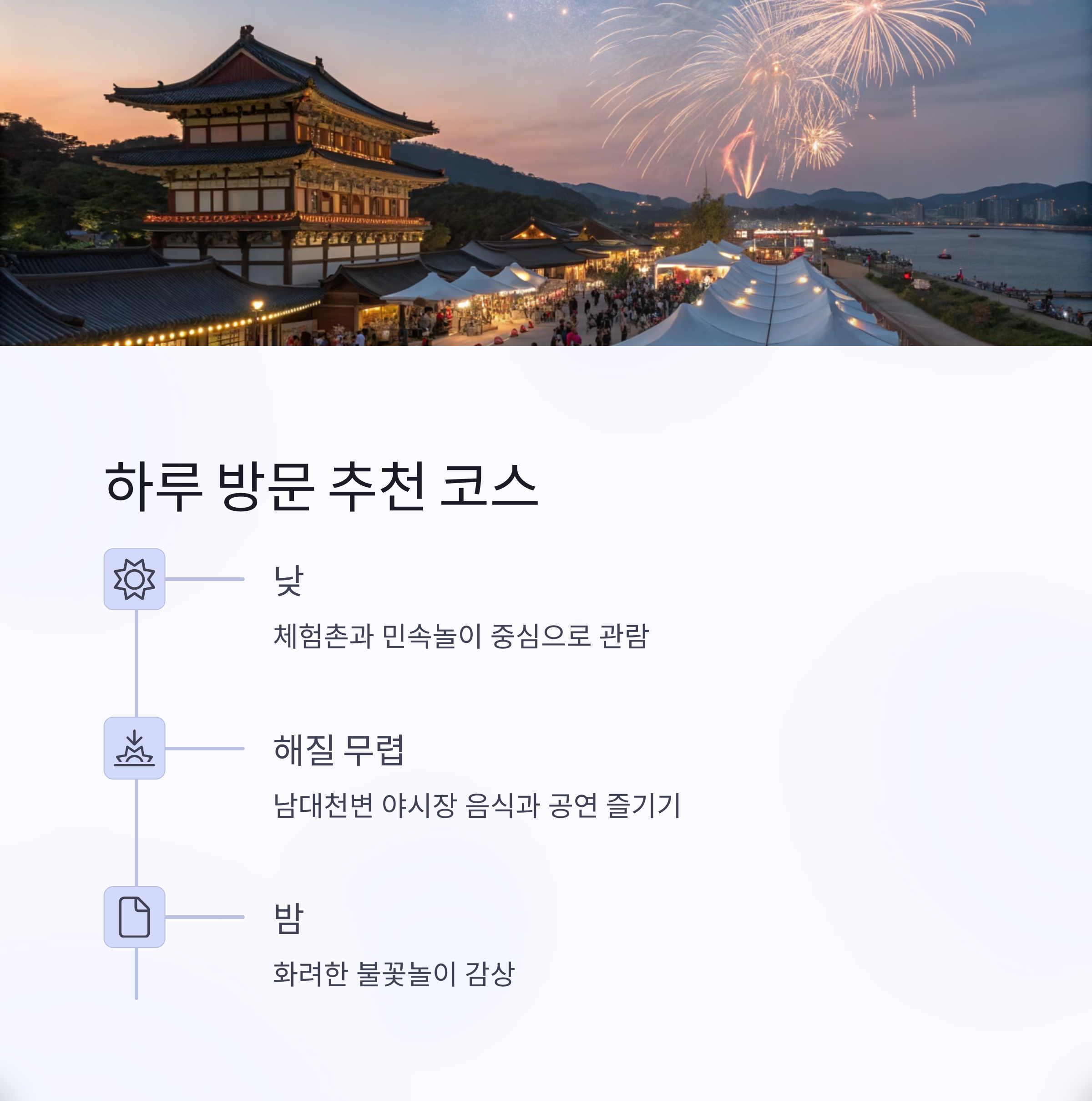 즐기시길 추천드려요. 밤에는 불꽃놀이도 꼭 놓치지 마세요!