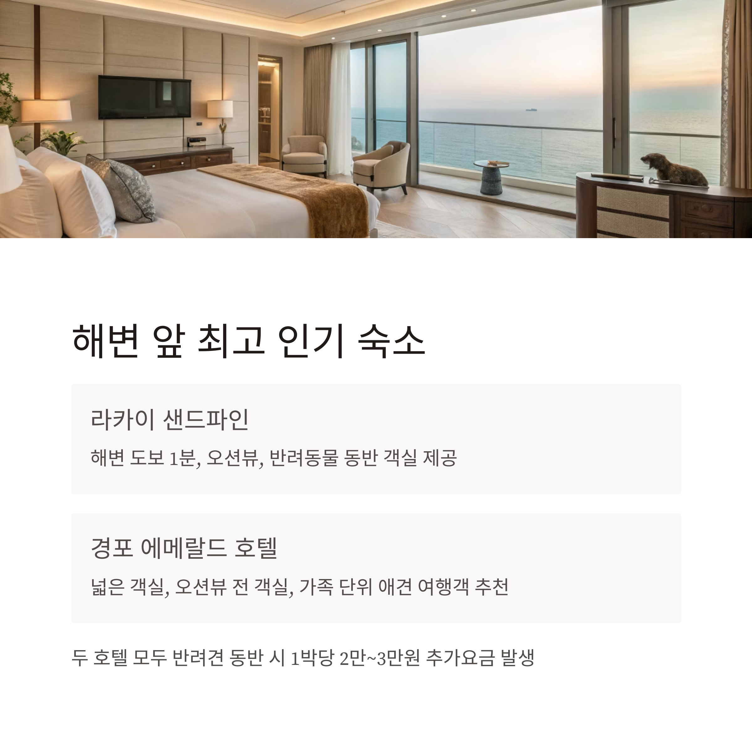 오션뷰 전 객실 등 가족 단위 애견 여행객에게 특히 추천됩니다.