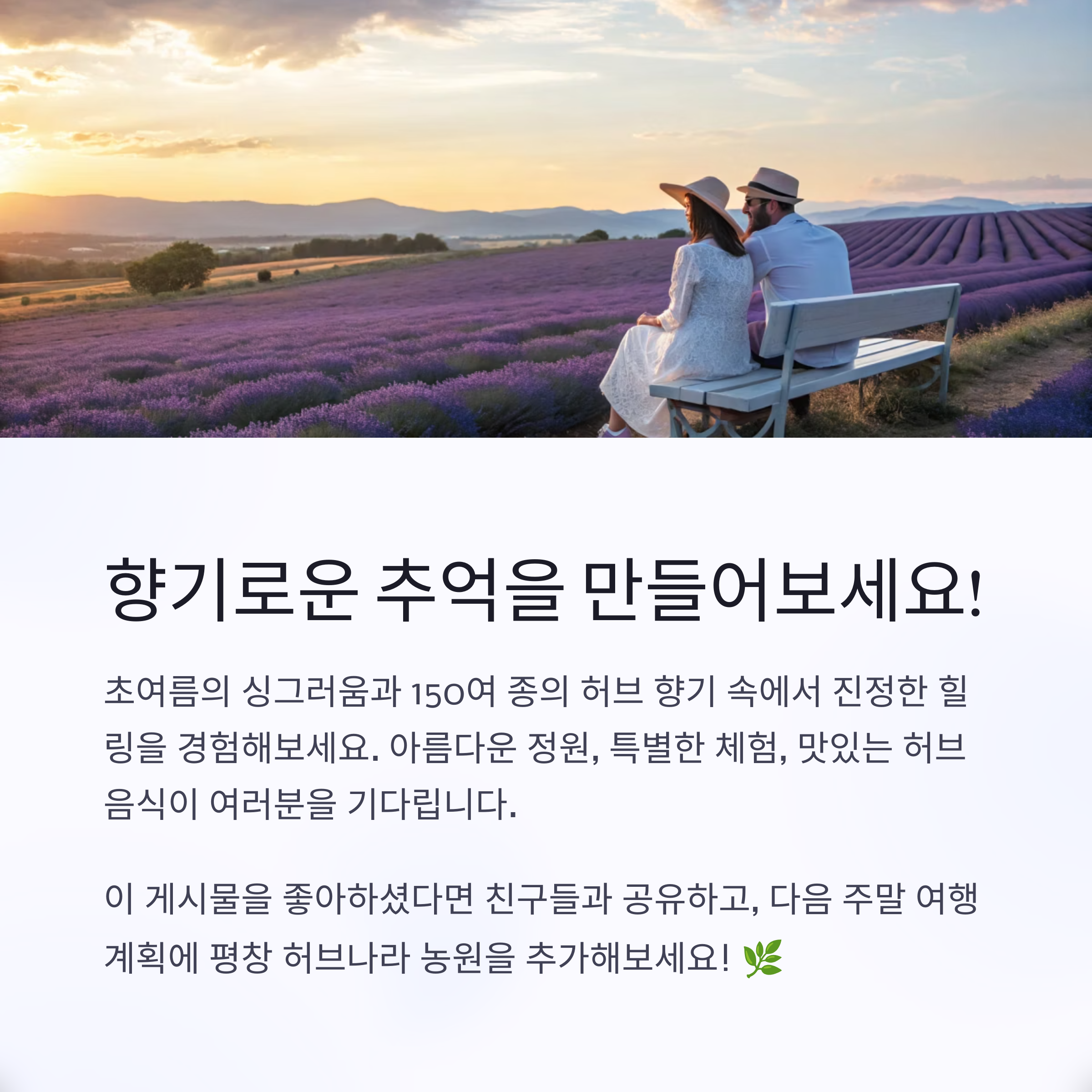 이번 주말, 사랑하는 사람들과 함께 평창 허브나라 농원으로 떠나 초여름 향기 가득한 잊지 못할 추억을 만들어 보는 건 어떨까요? 분명 후회하지 않을 선택이 될 것입니다.