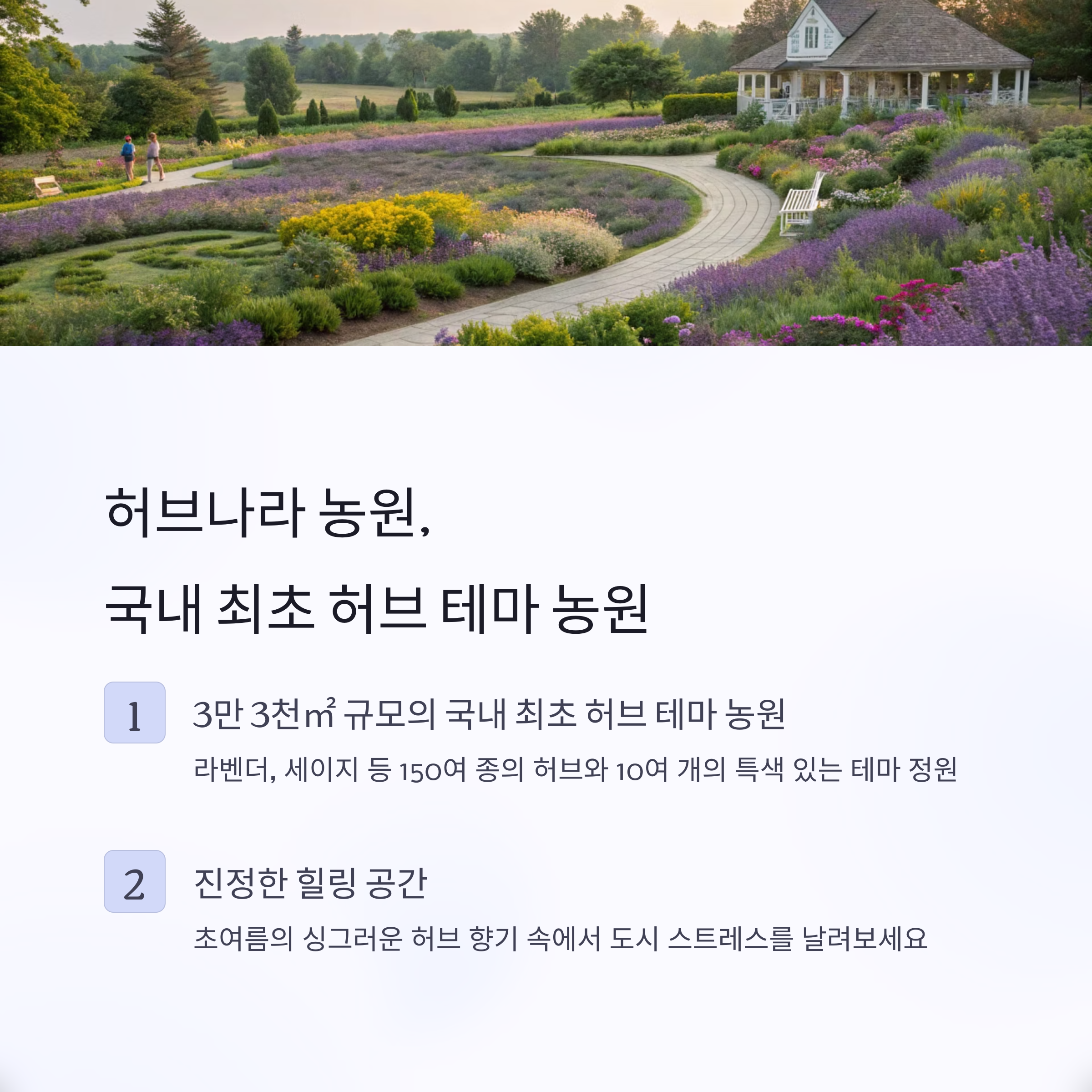 평창 허브나라 농원은 약 3만 3천 제곱미터(㎡) 규모로 조성된 국내 최초의 허브 테마 농원입니다. 이곳에는 라벤더, 세이지 등 무려 150여 종의 다양한 허브가 식재되어 있으며, 10여 개의 특색 있는 테마 정원이 조화롭게 어우러져 있습니다. 셰익스피어 가든, 나비 가든 등 각 정원마다 고유한 테마와 볼거리가 가득해서 방문객들에게 끊임없이 새로운 즐거움을 선사합니다.