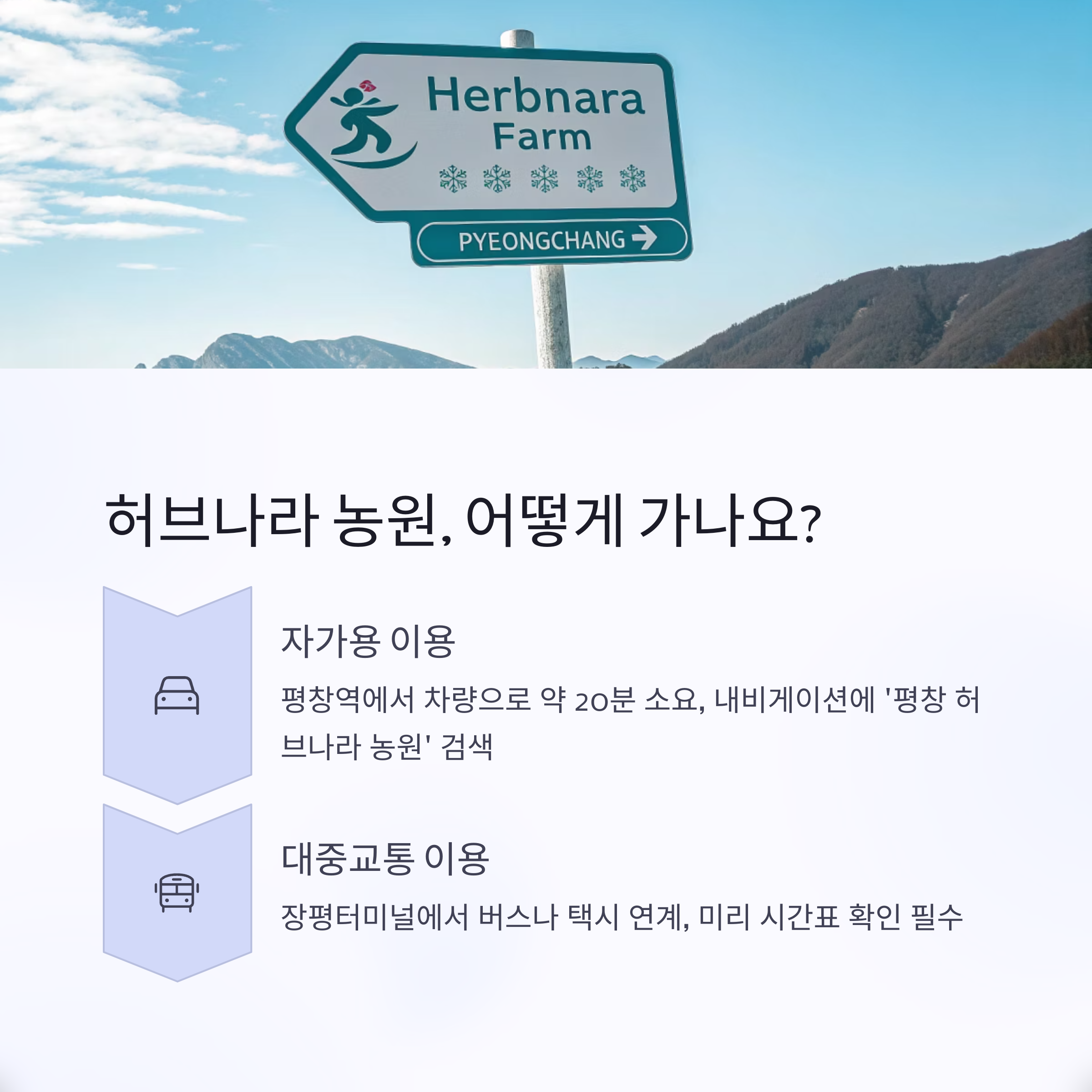 자차 이용 시: 평창역에서 차량으로 약 20분 정도 소요됩니다. 내비게이션에 '평창 허브나라 농원'을 검색하면 쉽게 찾아갈 수 있습니다.