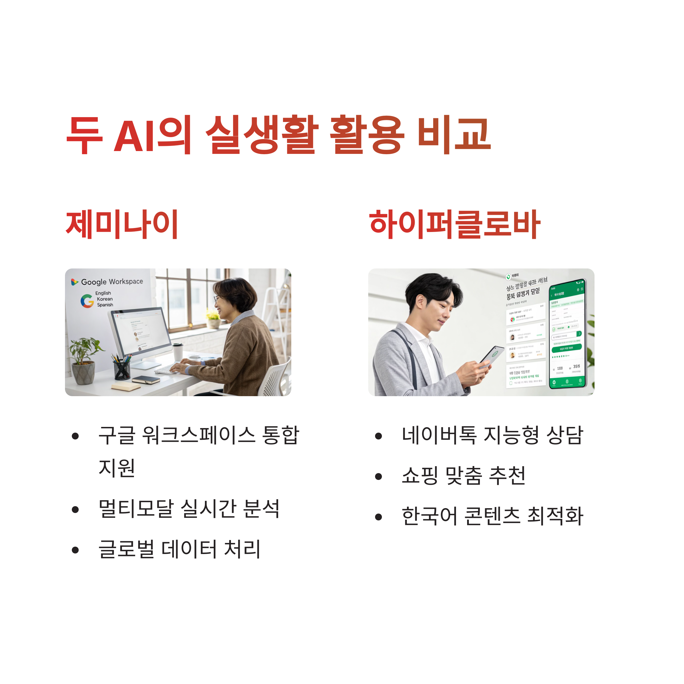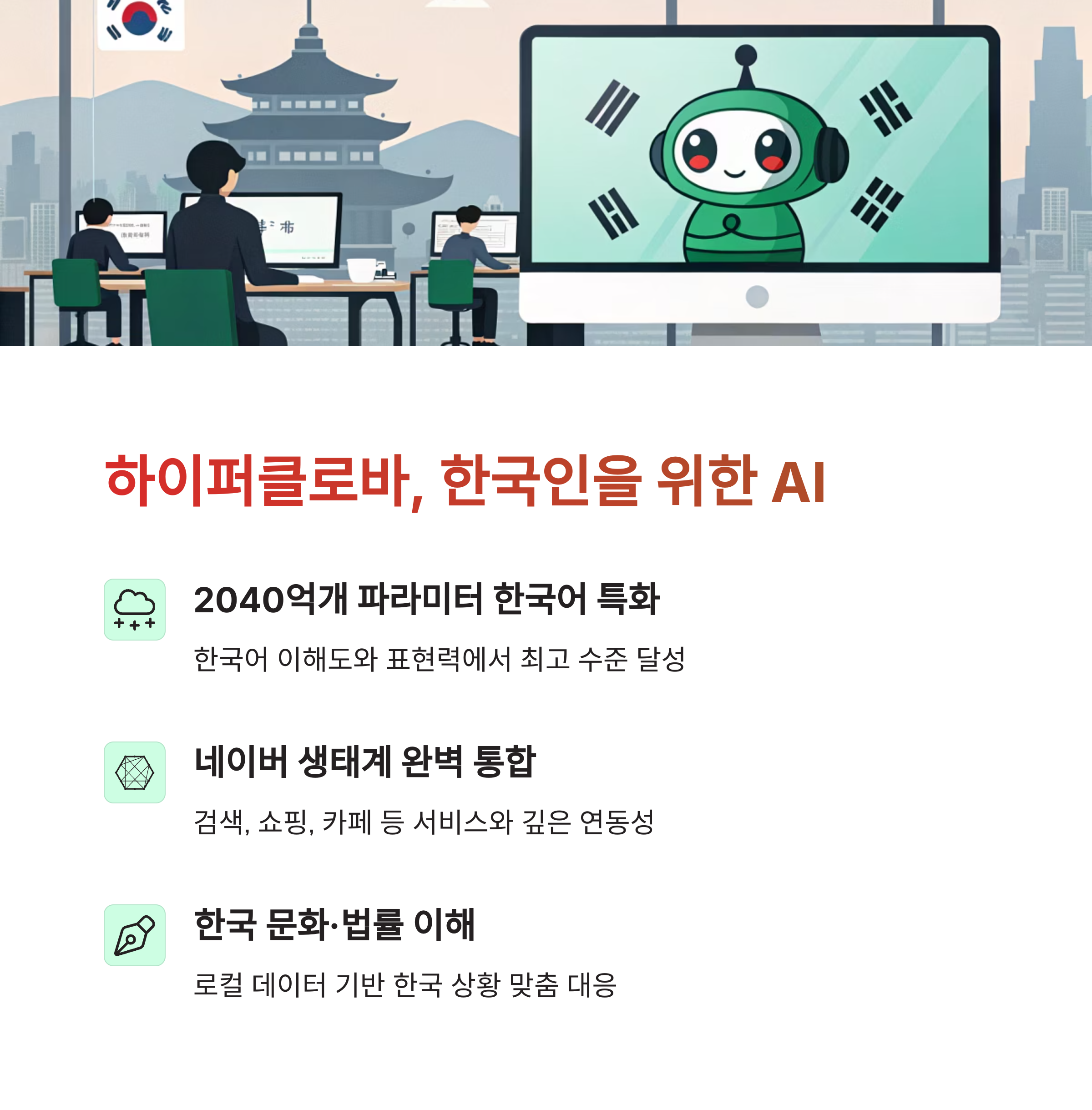 | 멀티모달 기능, 글로벌 언어 지원 | 한국어 최적화, 네이버 생태계 연동 | 글로벌 vs 로컬, 범용성 vs 실용성 |