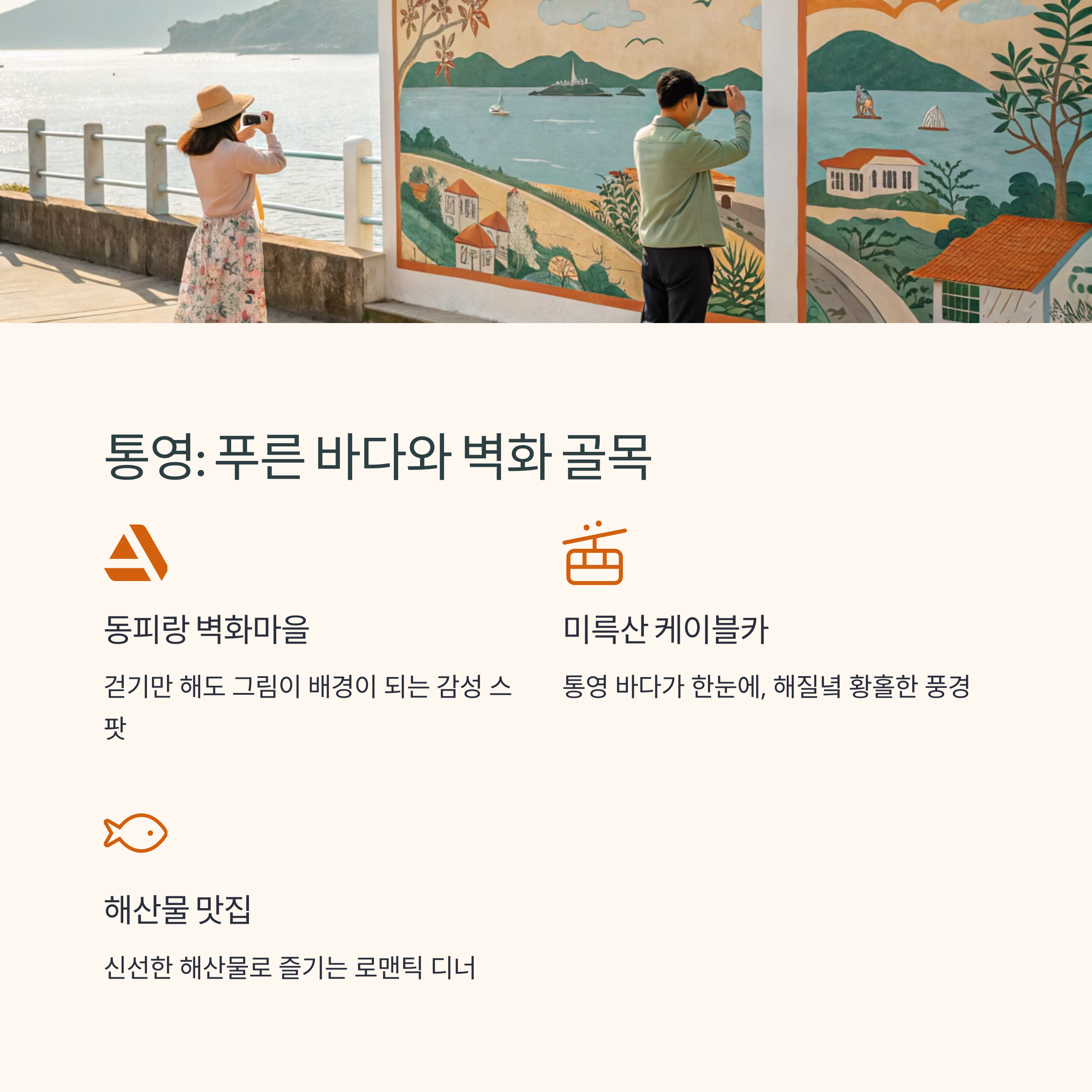 통영은 바다도 예쁘고, 골목마다 감성 가득한 벽화들 덕분에 커플 여행으로 인기 많아요.