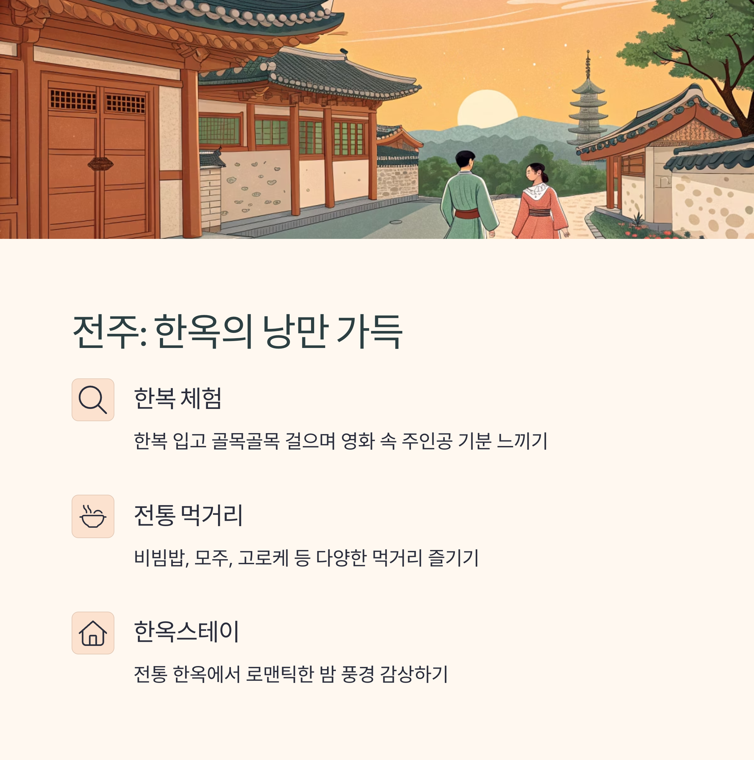 숙소는 한옥스테이를 선택하면 밤 풍경까지 로맨틱하게 즐길 수 있고요.