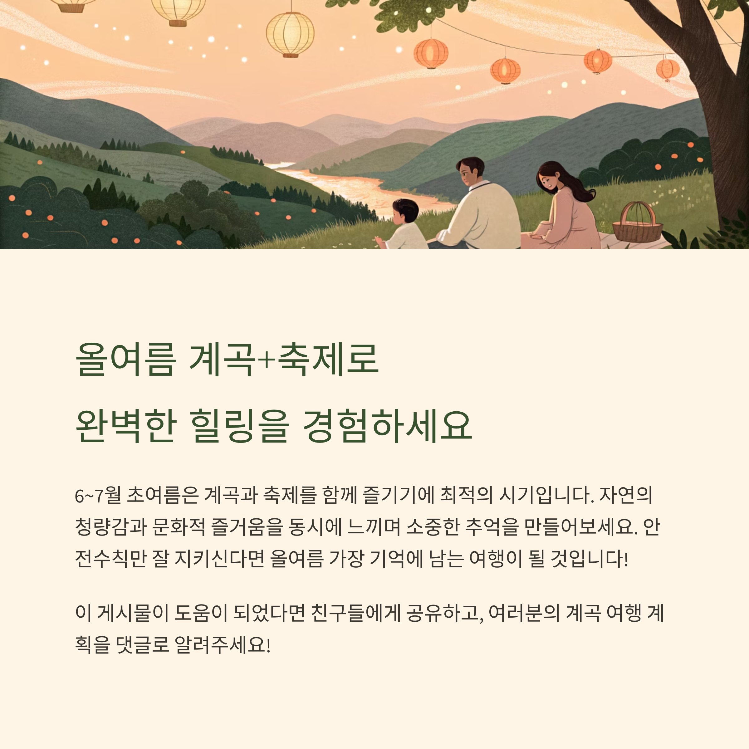 계곡과 축제를 함께 즐기는 여행은 몸과 마음 모두를 시원하게 만들어주는 완벽한 힐링이에요. 자연의 청량감과 문화적 즐거움을 동시에 느낄 수 있어서 정말 특별한 경험이 될 거예요.