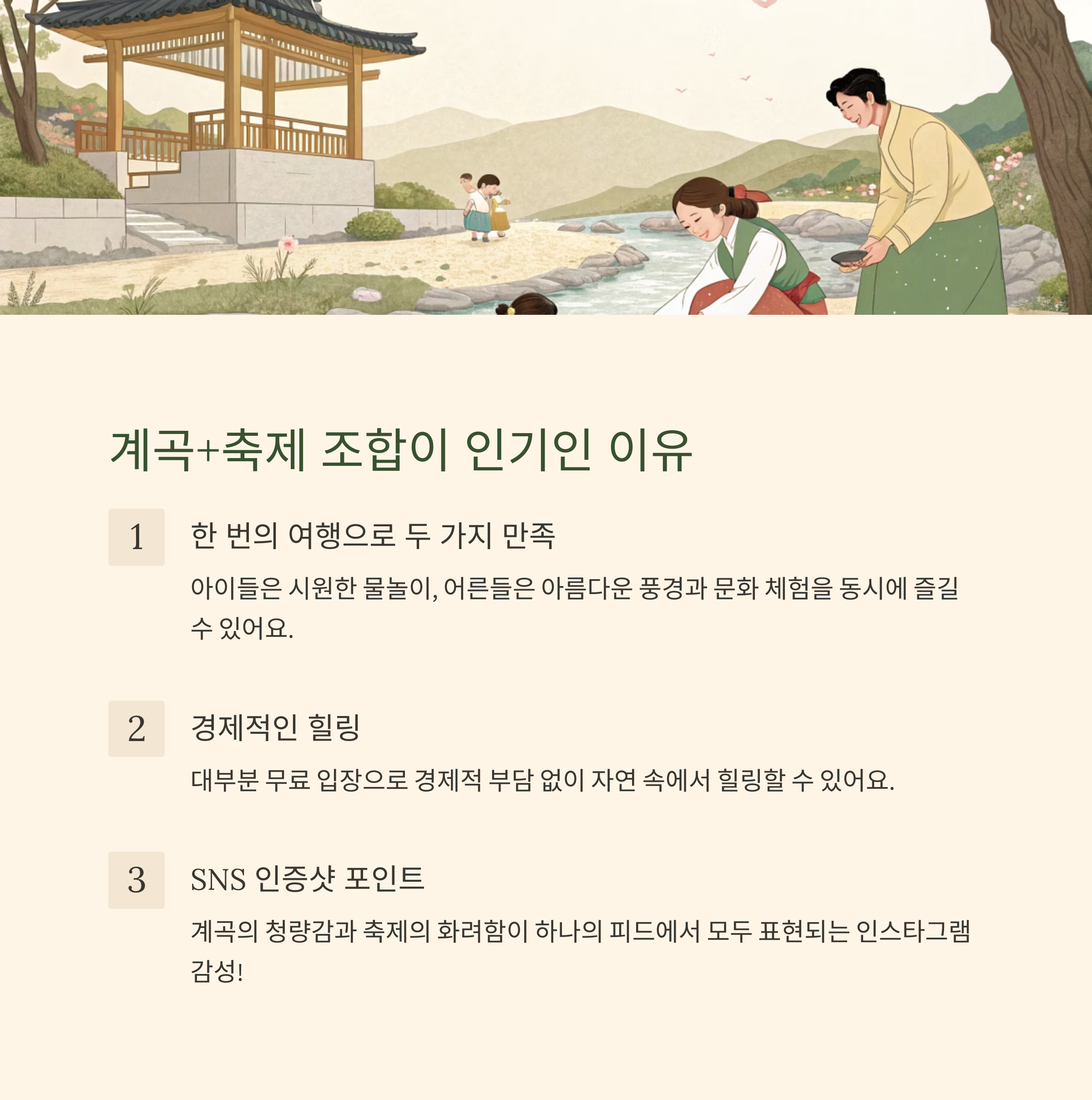 계곡과 축제의 조합이 인기인 이유는 한 번의 여행으로 두 가지 만족을 얻을 수 있기 때문이에요. 아이들은 시원한 물놀이를, 어른들은 아름다운 풍경과 문화 체험을 함께 즐길 수 있어서 가족 여행지로 최적입니다.
