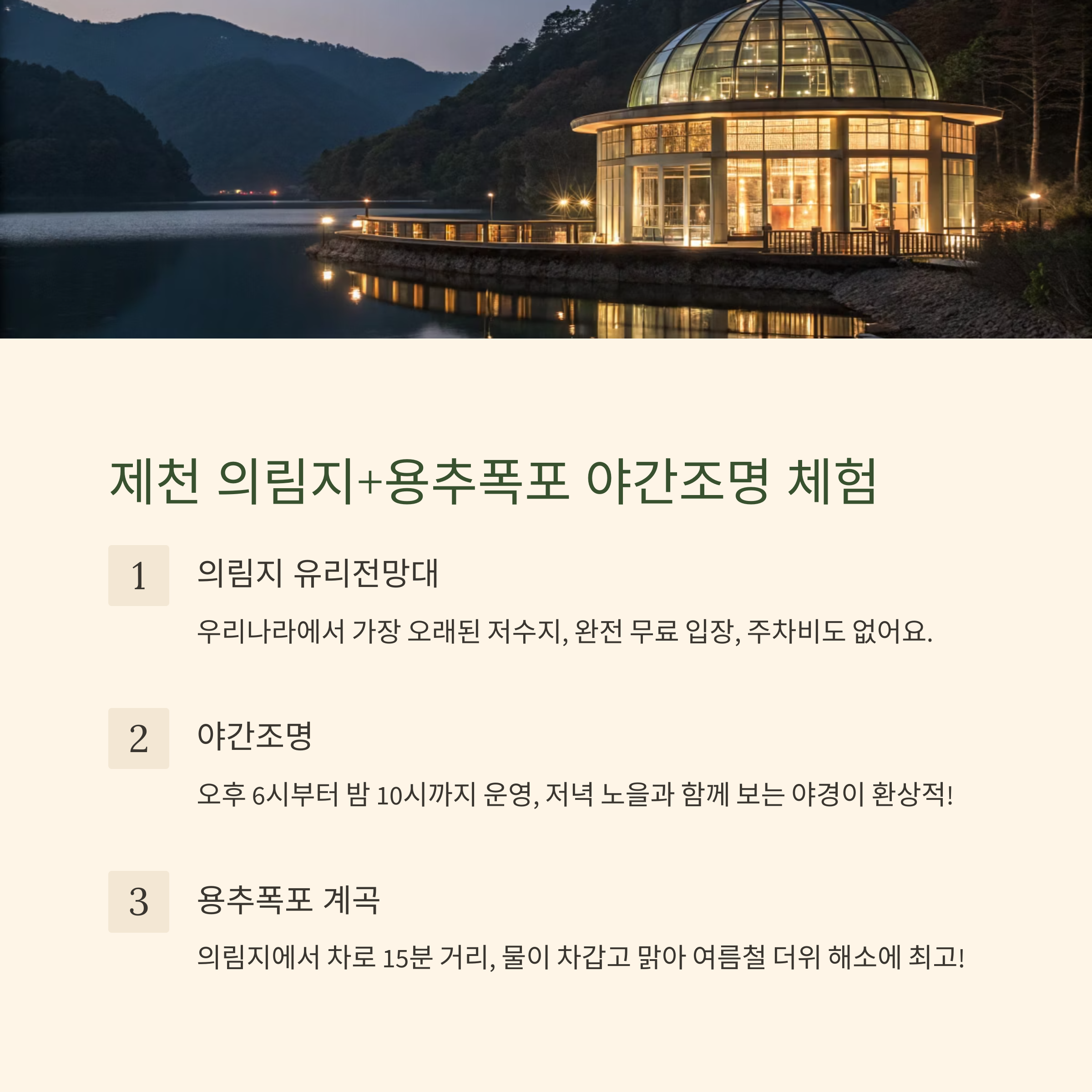 주변에 펜션과 캠핑장도 많아서 1박 2일 여행으로 계획하기에도 좋아요. 제천 약초축제나 제천 국제음악영화제 같은 지역 축제와 연계해서 방문하면 더욱 알찬 여행이 될 거예요.