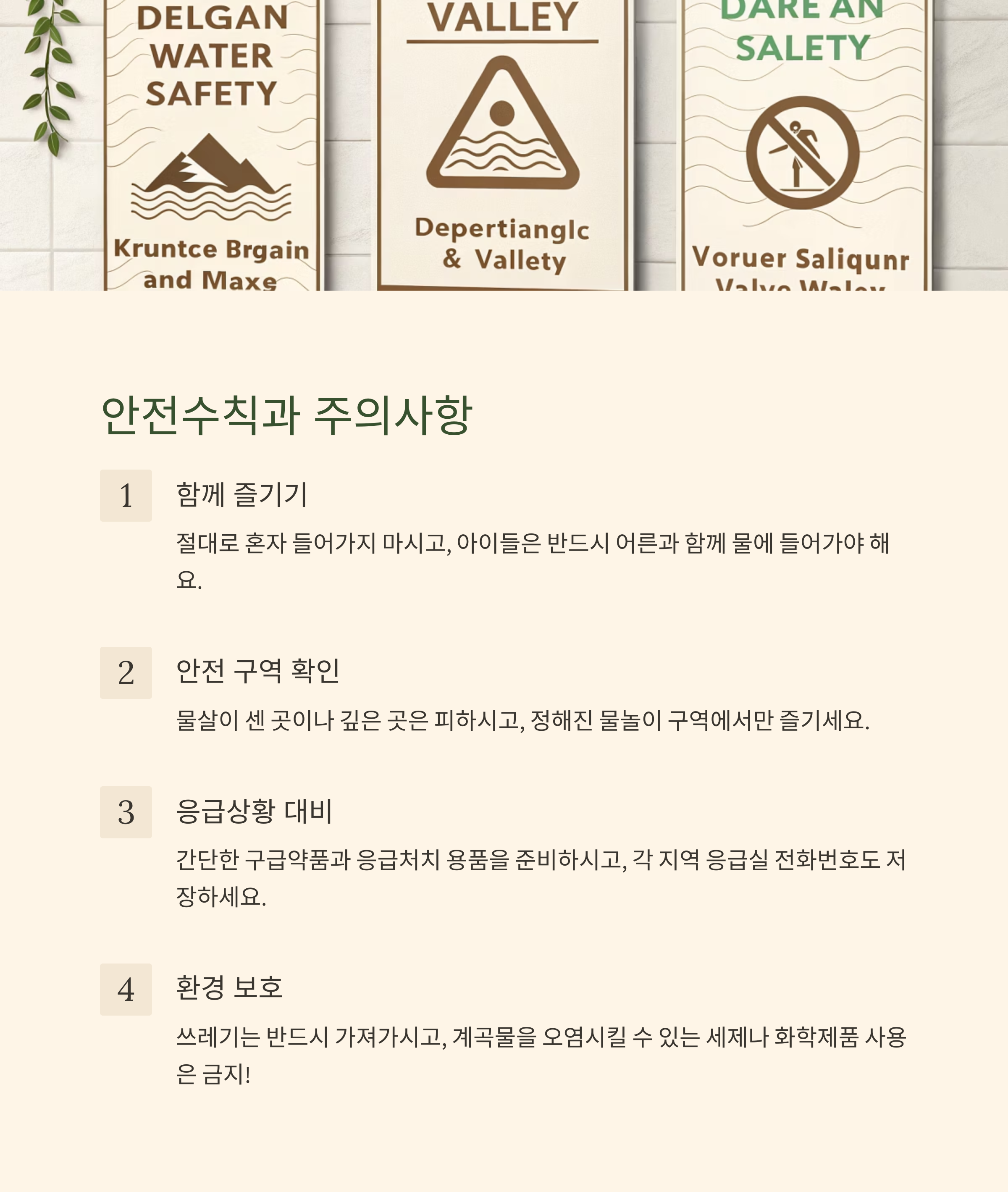 물살이 센 곳이나 깊은 곳은 피하시고, 정해진 물놀이 구역에서만 즐기세요. 갑작스러운 물의 불어남도 있을 수 있으니까 기상 상황을 미리 체크하는 것도 중요해요.