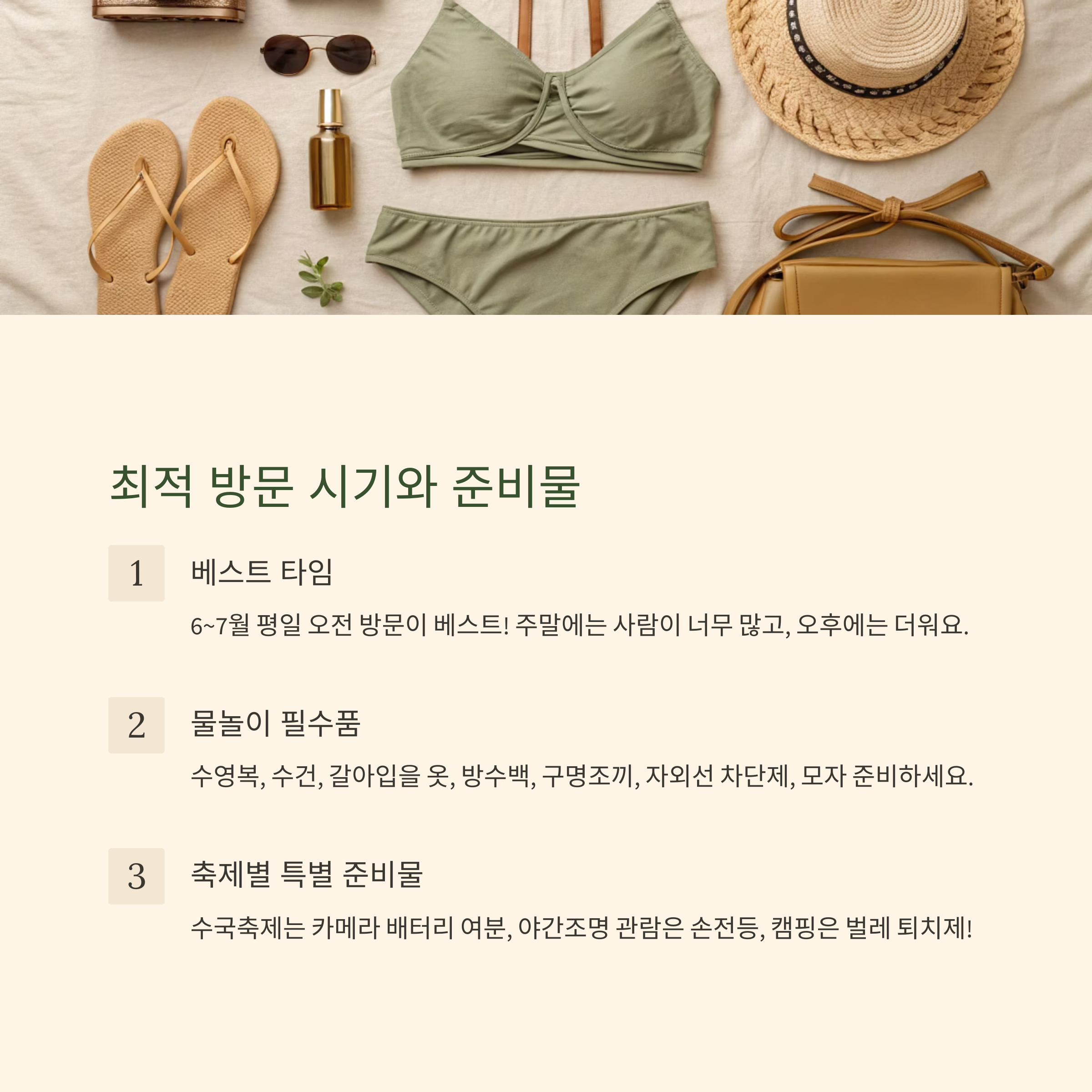 준비물로는 물놀이용품이 기본이에요. 수영복, 수건, 갈아입을 옷, 방수백 등을 준비하시고, 구명조끼나 튜브 같은 안전용품도 잊지 마세요.