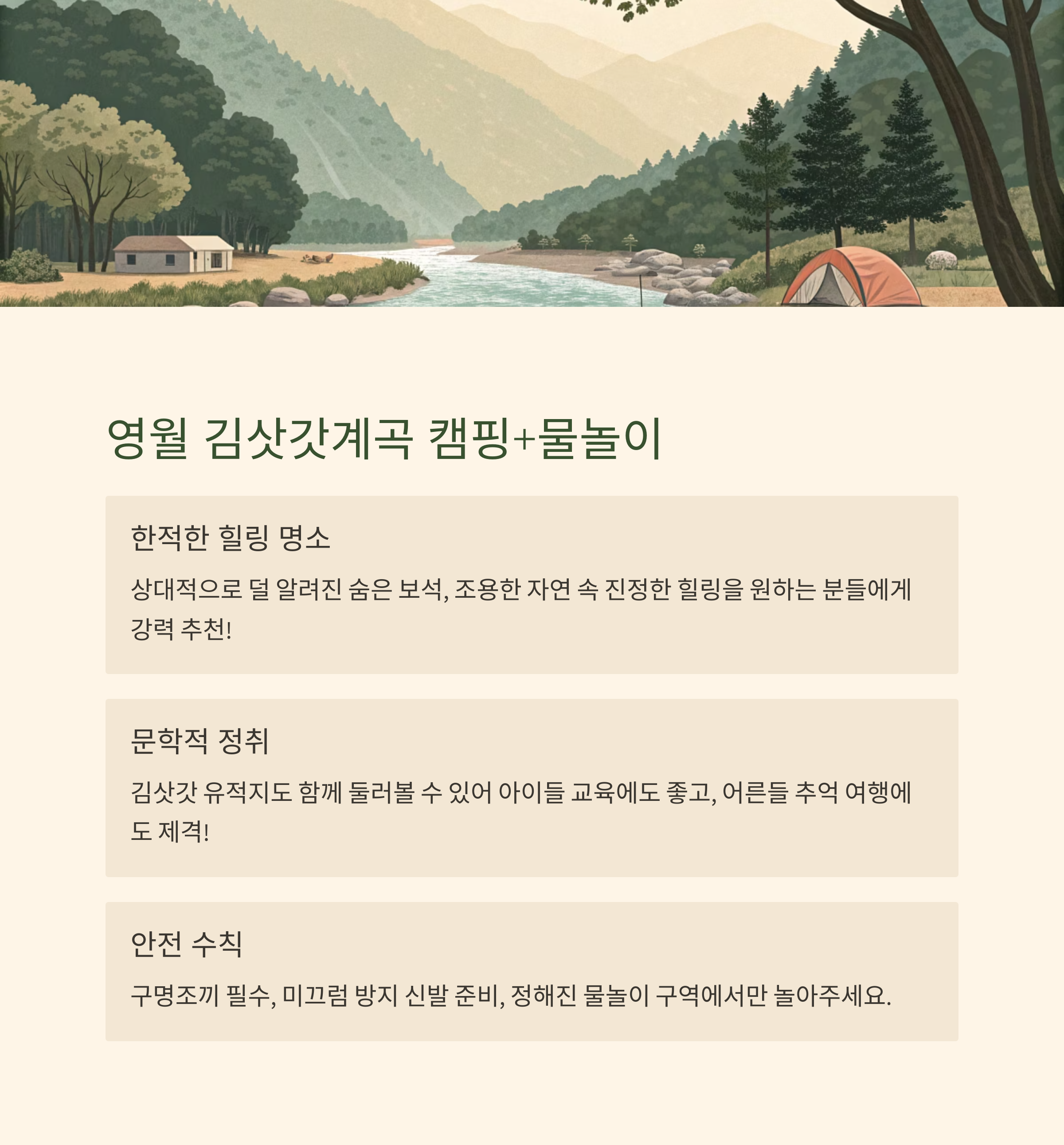 영월 김삿갓계곡은 상대적으로 덜 알려진 숨은 보석 같은 곳이에요. 한적하고 조용해서 진정한 힐링을 원하는 분들에게 강력 추천합니다. 캠핑장도 함께 운영되어서 계곡 물놀이와 캠핑을 동시에 즐길 수 있어요.