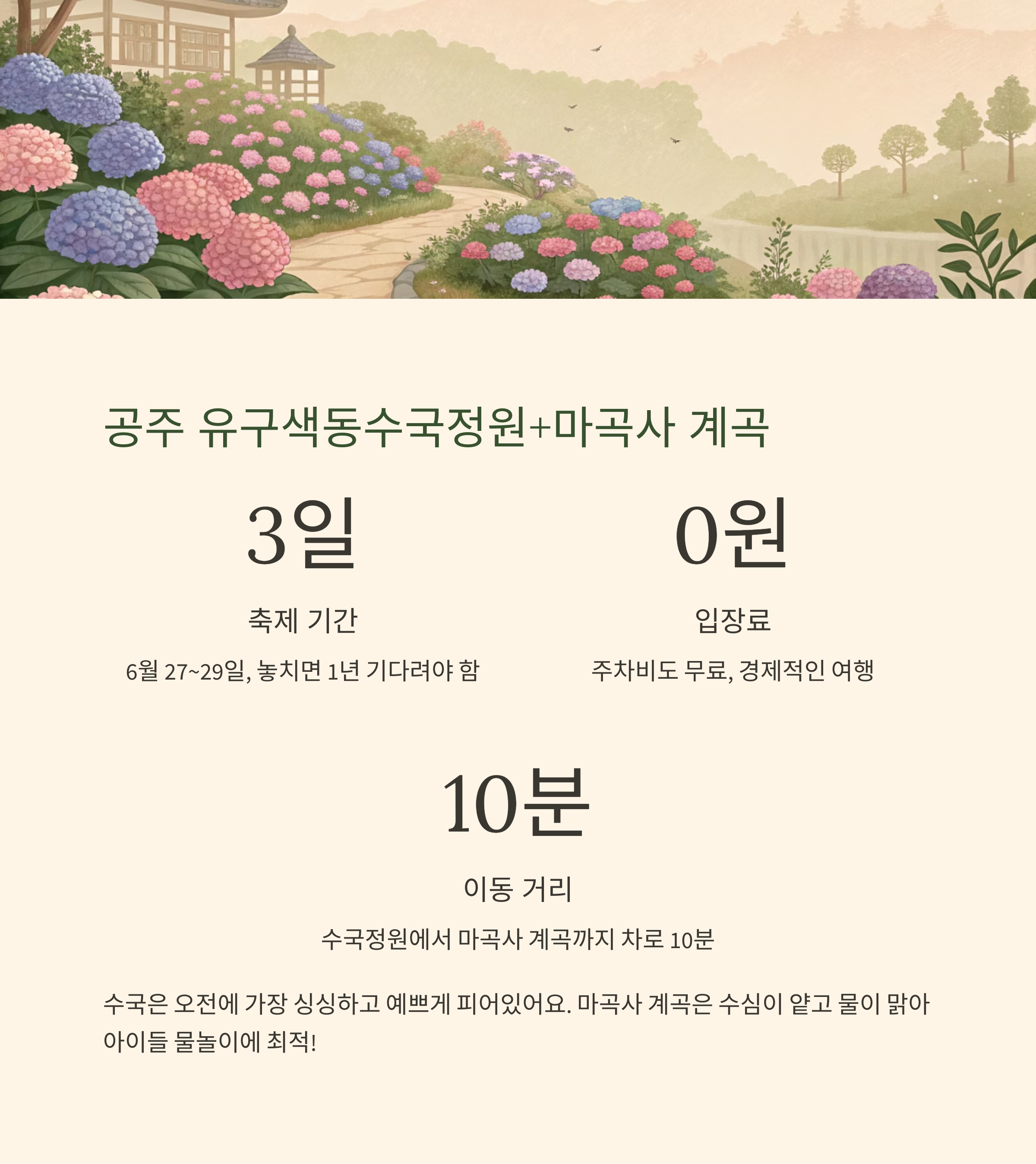 수국정원에서 마곡사까지는 차로 10분 정도 거리라서 연계 여행이 정말 편리해요. 수국 구경을 마치고 마곡사 앞 계곡에서 물놀이를 즐기는 완벽한 코스를 만들 수 있어요.
