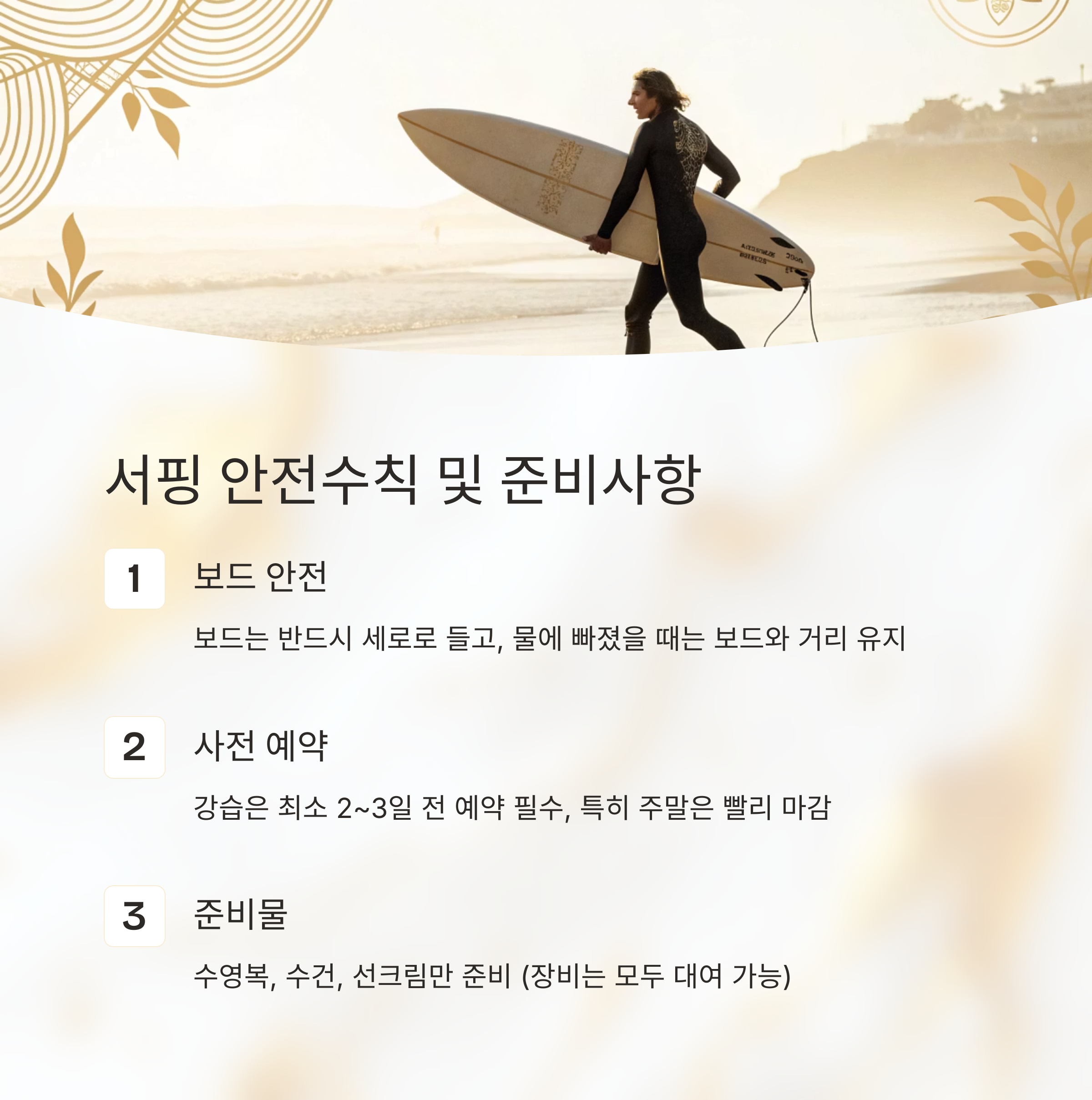 서핑뿐만 아니라 패들보드, 카약 등 다양한 해양스포츠를 함께 즐길 수 있어서 가족 모두가 만족할 수 있는 액티비티 여행지입니다. 오전 시간대에 방문해서 2~3시간 강습을 받고, 오후에는 주변 관광지를 둘러보는 코스로 알찬 하루를 보내실 수 있을 거예요.