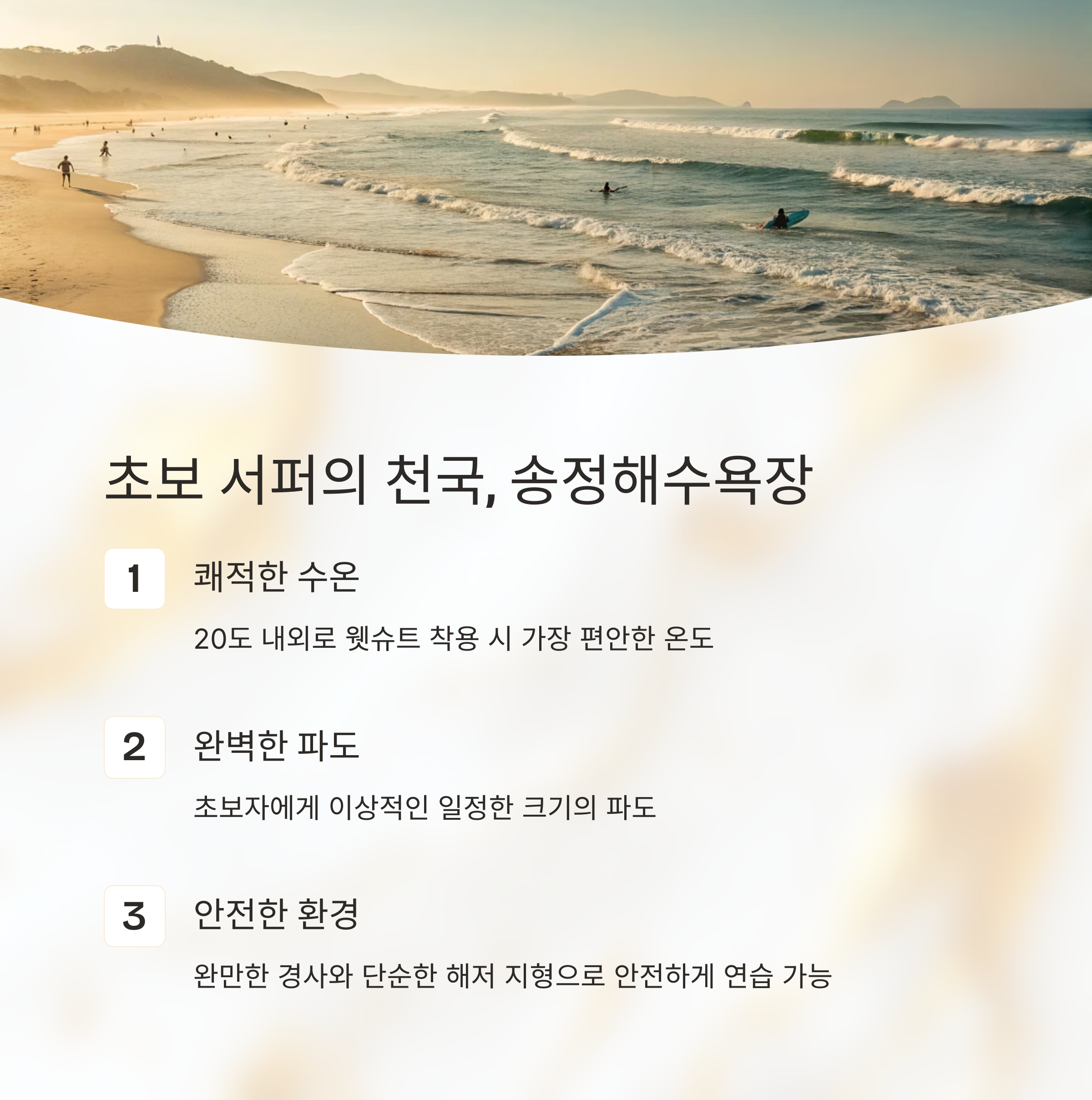 송정해수욕장의 가장 큰 장점은 파도의 일정함입니다. 해운대처럼 갑자기 큰 파도가 치거나 너무 잔잔하지도 않고, 초보자가 연습하기에 딱 맞는 크기의 파도가 꾸준히 들어와요. 모래사장의 경사도 완만해서 넘어져도 안전하고, 해저 지형이 복잡하지 않아 초보자들이 두려움 없이 도전할 수 있습니다.