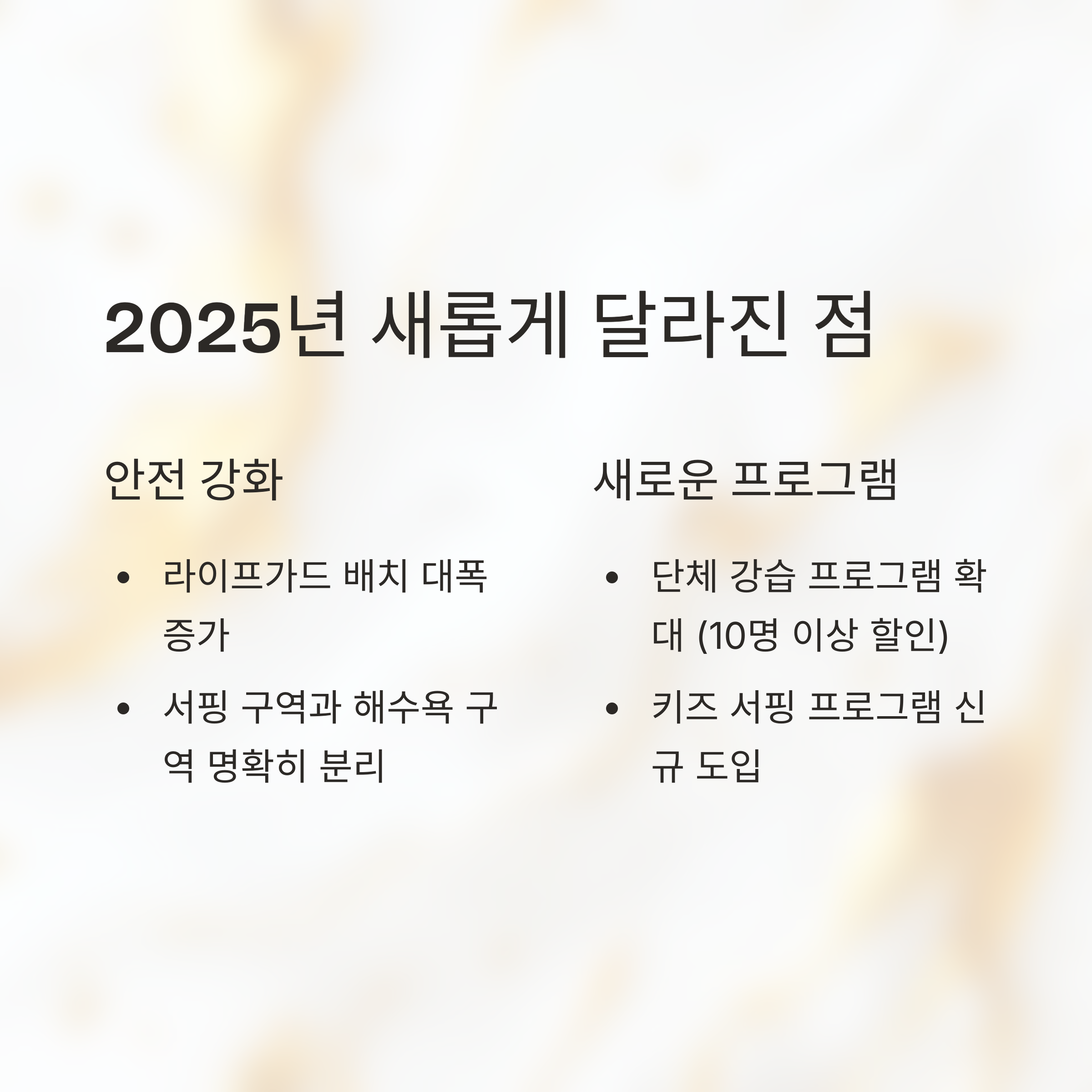 2025년부터 안전요원 배치가 대폭 강화되었습니다. 해수욕장 곳곳에 라이프가드가 상주하고 있어서 응급상황에 신속하게 대응할 수 있어요.