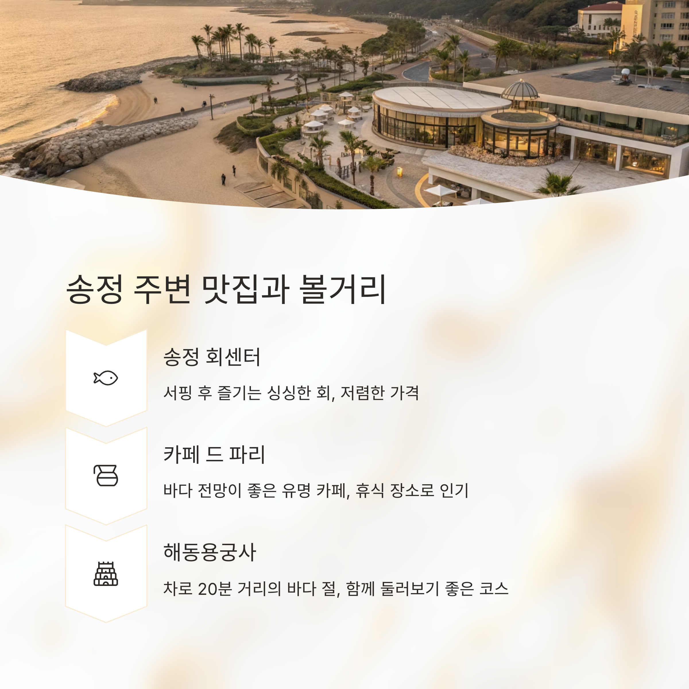 송정해수욕장 주변에는 회센터와 카페들이 많이 있어요. 특히 송정 회센터에서는 싱싱한 회를 저렴하게 즐길 수 있고, 서핑 후 출출할 때 딱 좋은 분위기입니다.