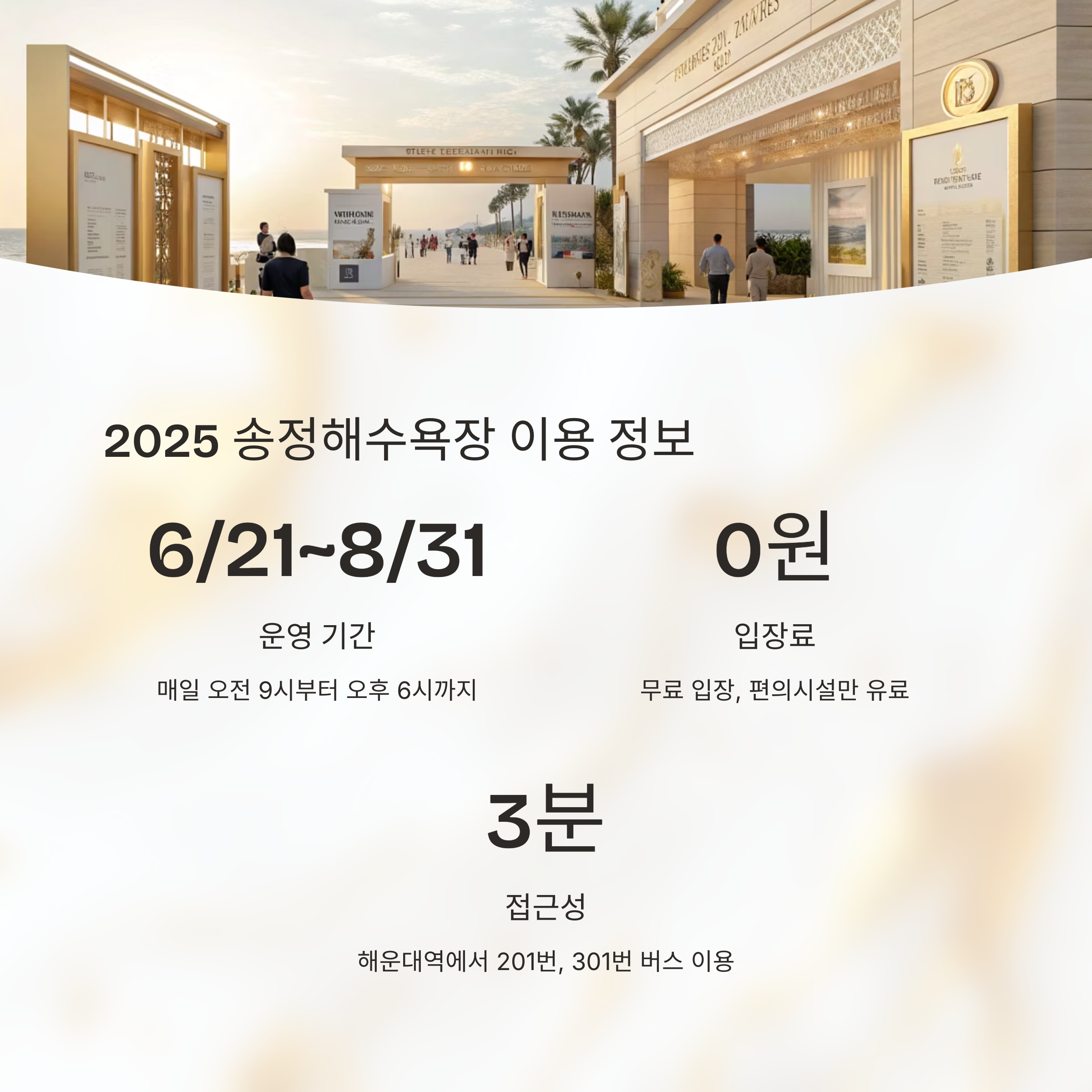 개장 기간은 6월 21일부터 8월 31일까지이며, 매일 오전 9시부터 오후 6시까지 운영됩니다. 입장료는 무료이지만, 편의시설은 유료로 운영되고 있어요.
