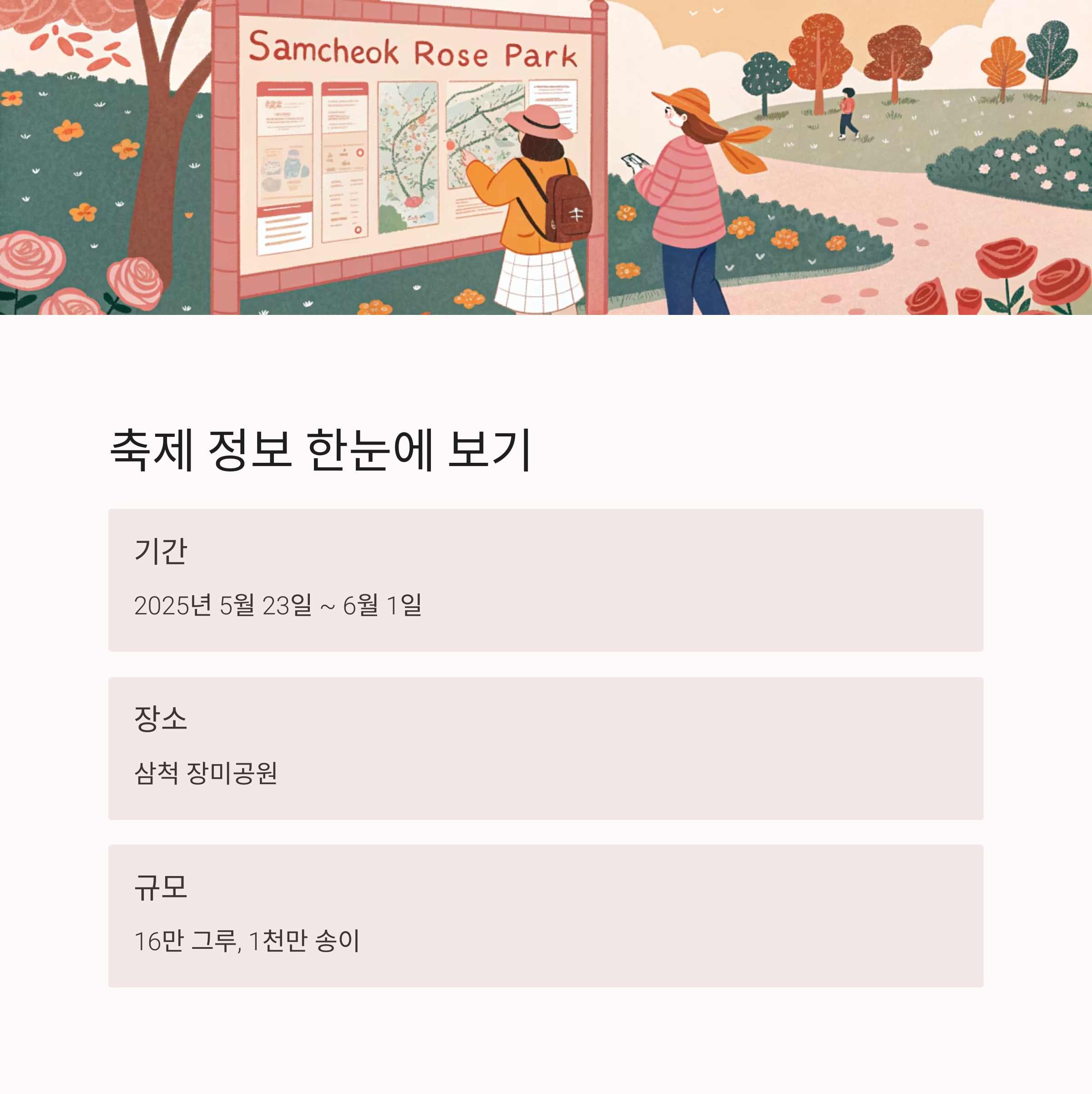 날짜, 장소, 장미의 규모, 그리고 핵심 콘텐츠를 확인해 보세요.