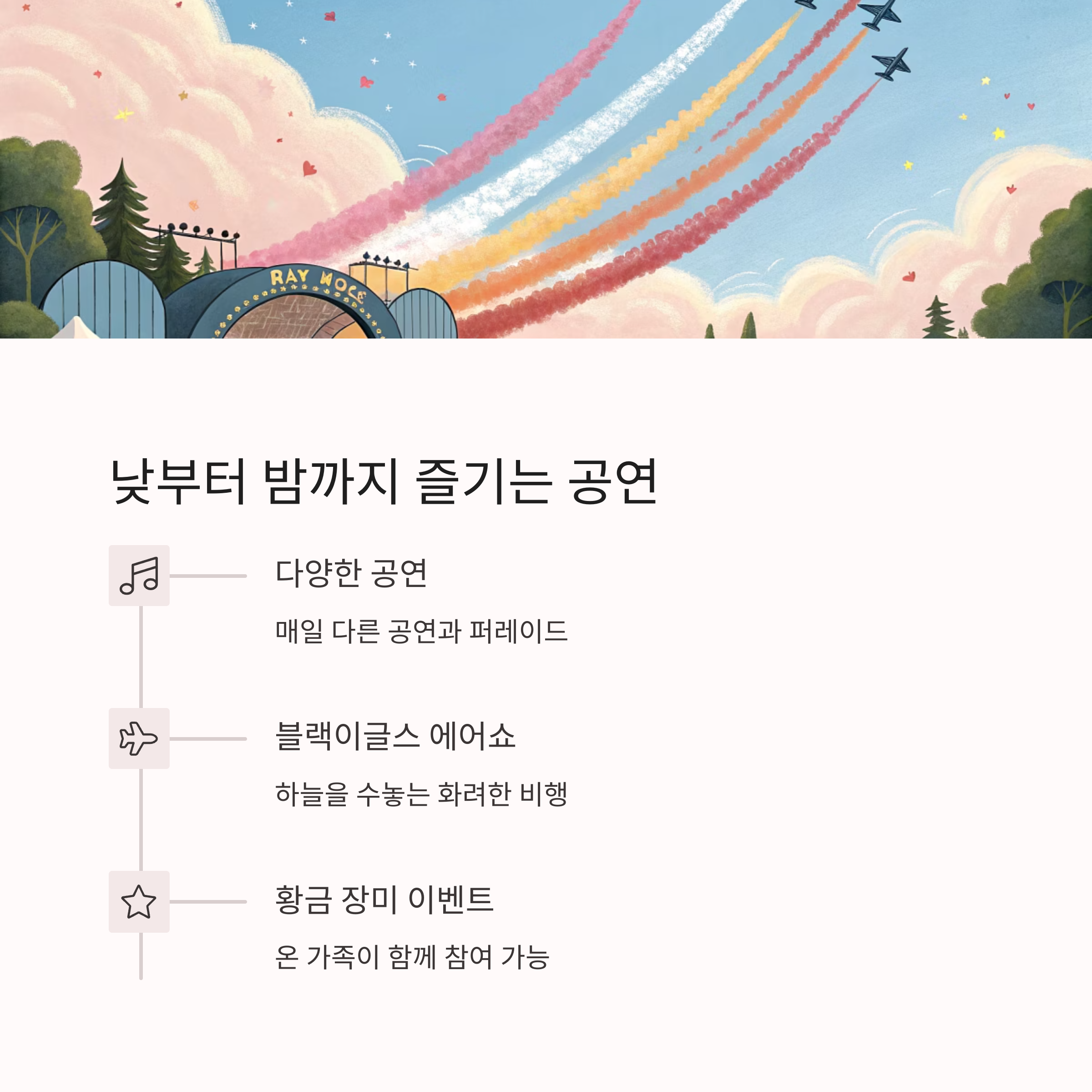 매일 다른 공연과 퍼레이드, 블랙이글스 에어쇼까지 준비돼 있어요.