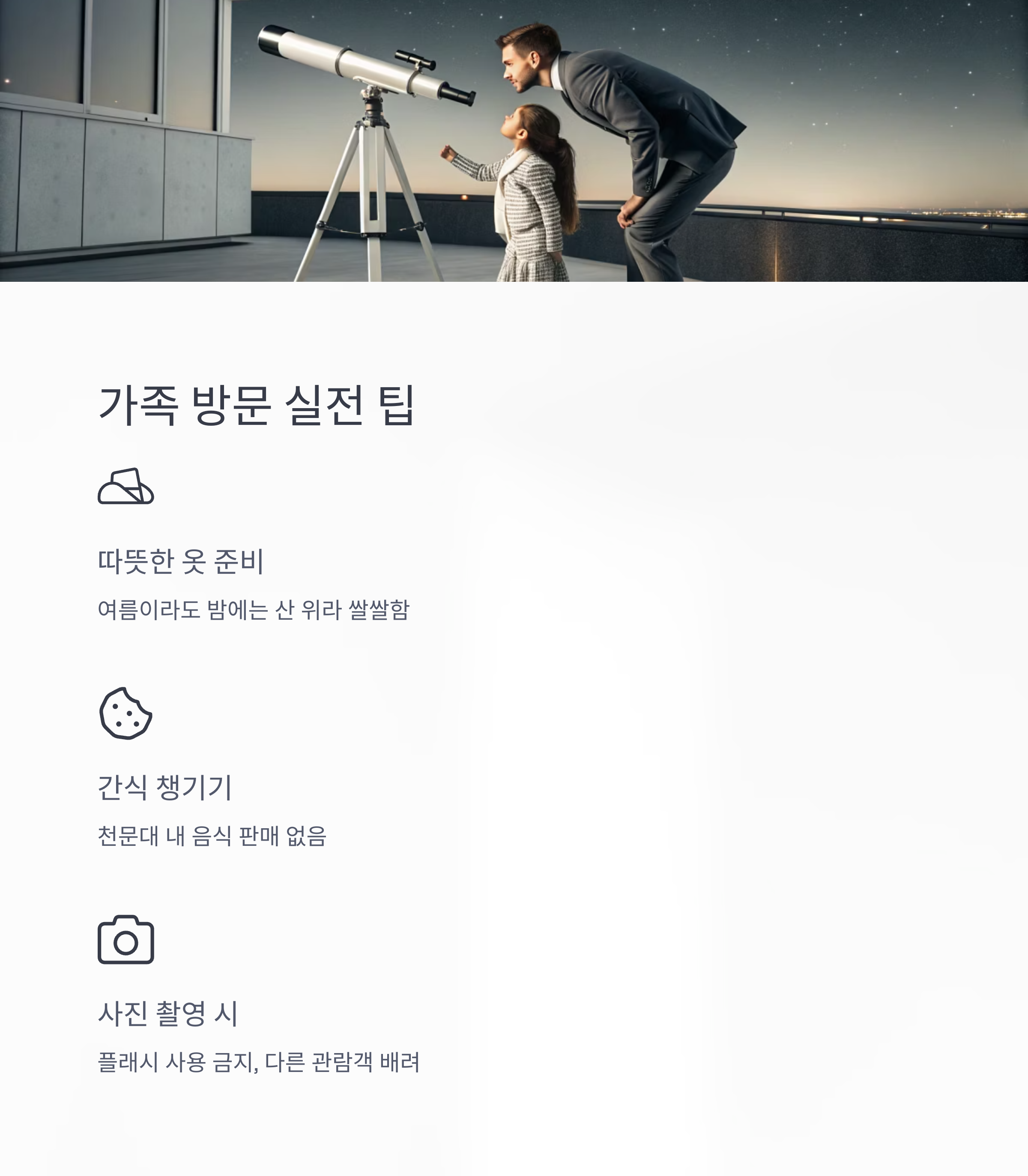 간단한 간식이나 물도 미리 준비해 가시면 좋아요. 천문대 내에서는 음식 판매를 안 하거든요. 아이들이 중간에 배고프다고 하면 곤란하니까 미리 준비하시는 게 좋아요.