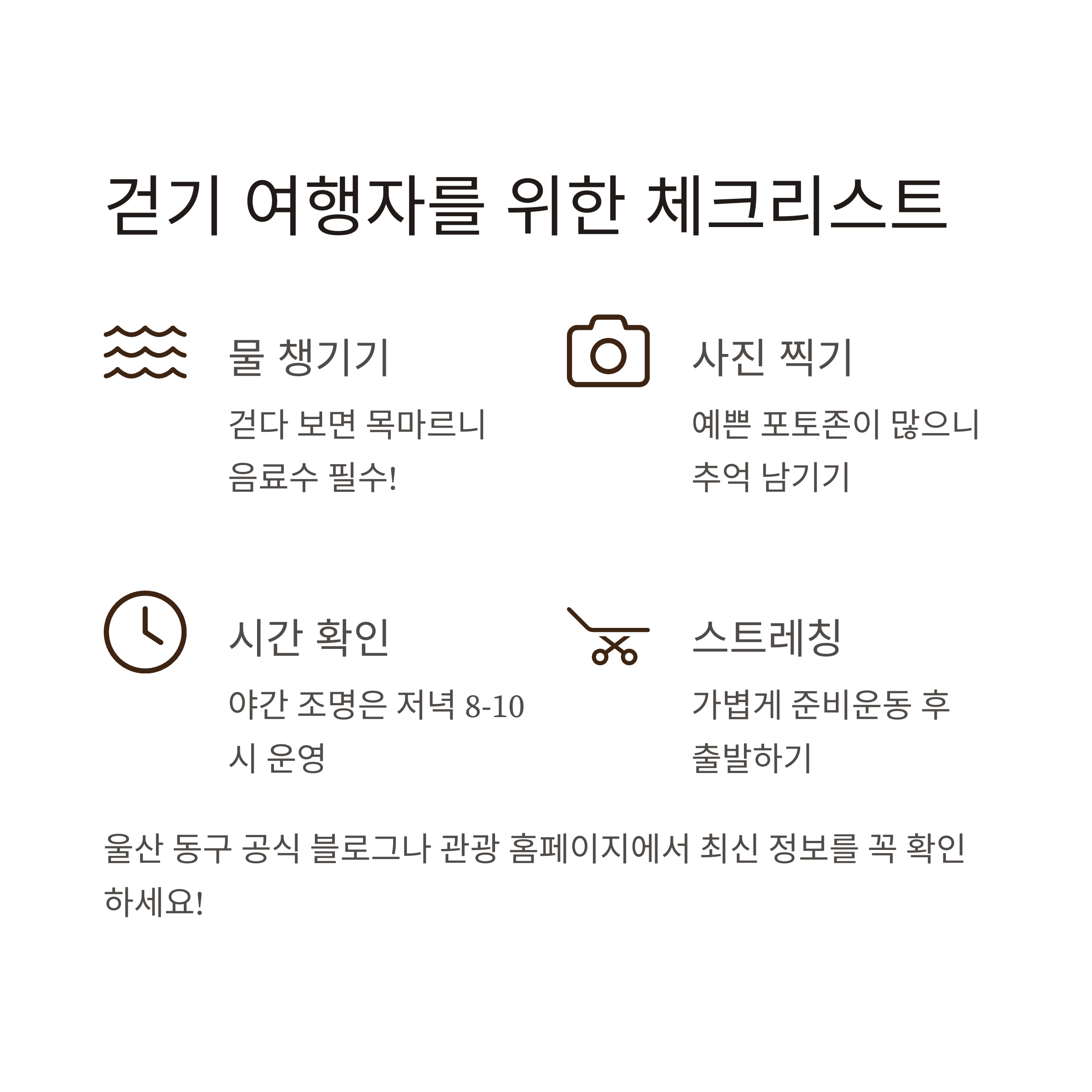 목표 거리와 시간을 확인하세요. 1.5km에서 2.5km 정도, 40분에서 60분 정도 소요된다는 점을 미리 알아두고 가세요. 가볍게 스트레칭을 해주면 훨씬 편하게 걸을 수 있어요. 걷다 보면 목마르니까 물이나 음료수 꼭 챙겨가세요. 대왕암공원에는 예쁜 포토존이 정말 많으니까, 사진 많이 남겨두세요! 하절기에는 저녁 8시부터 10시까지 조명이 켜지니, 야간 산책을 계획한다면 시간을 미리 확인해두는 게 좋아요. 울산 동구 공식 블로그나 관광 홈페이지에서 최신 정보를 꼭 확인하고 가세요.