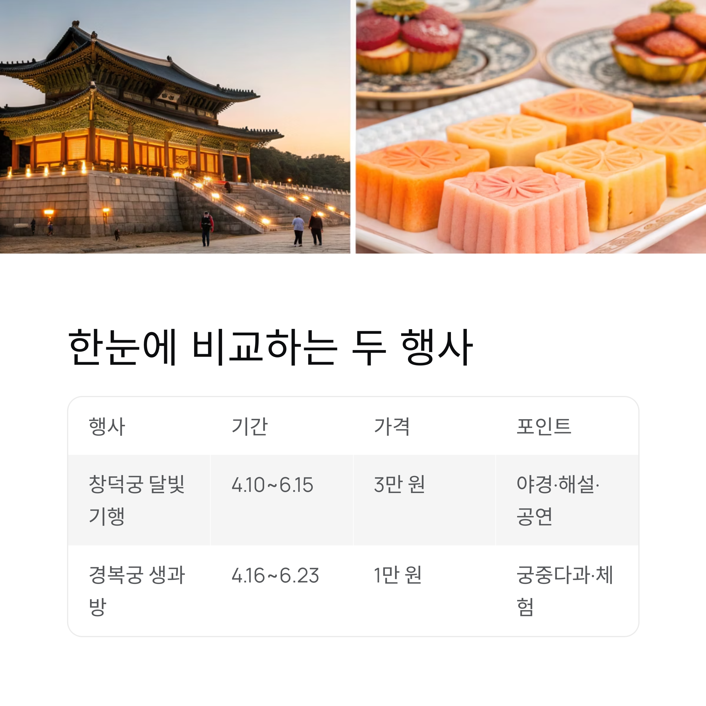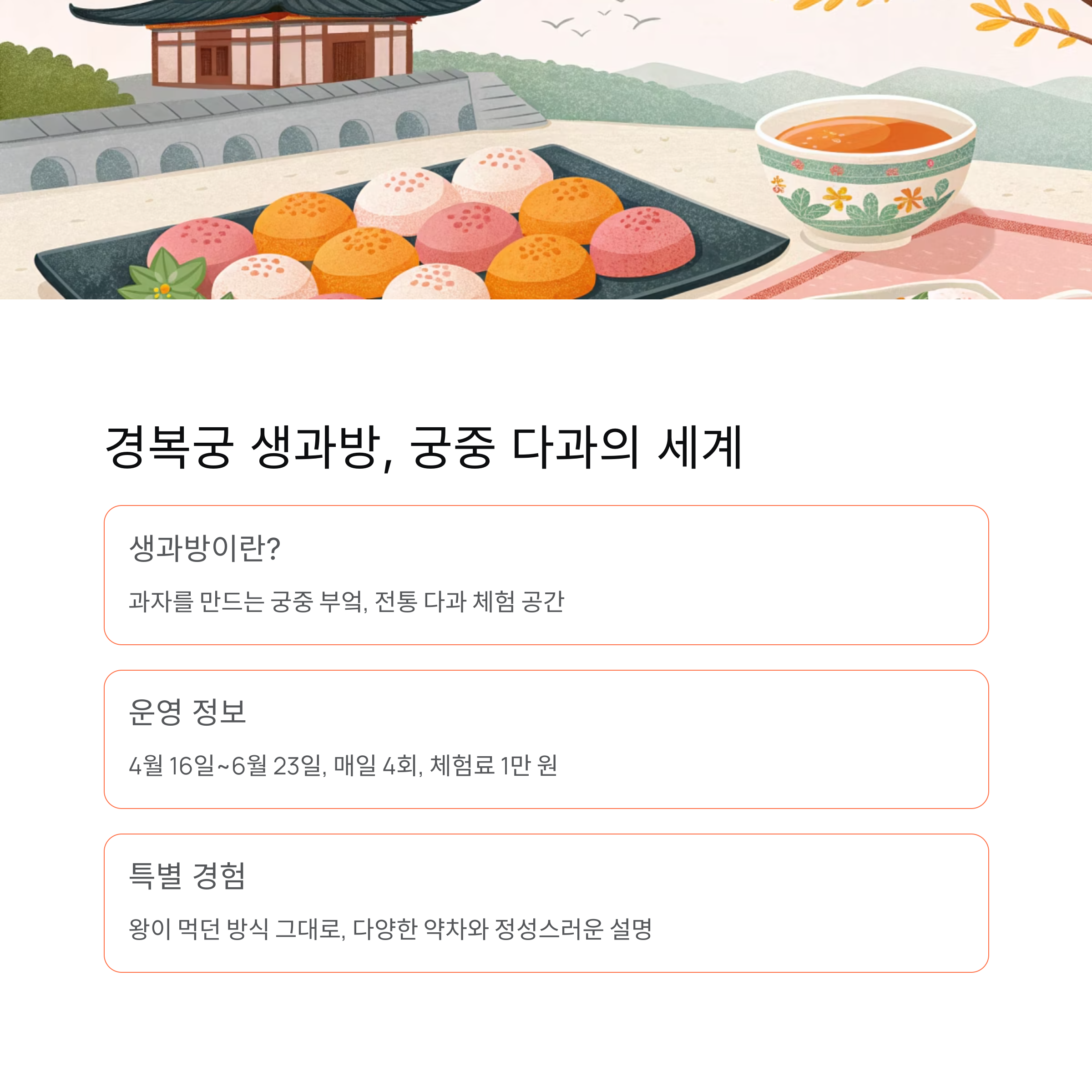 | 경복궁 생과방 | 4.16~6.23 | 1만 원 | 궁중다과·체험 |