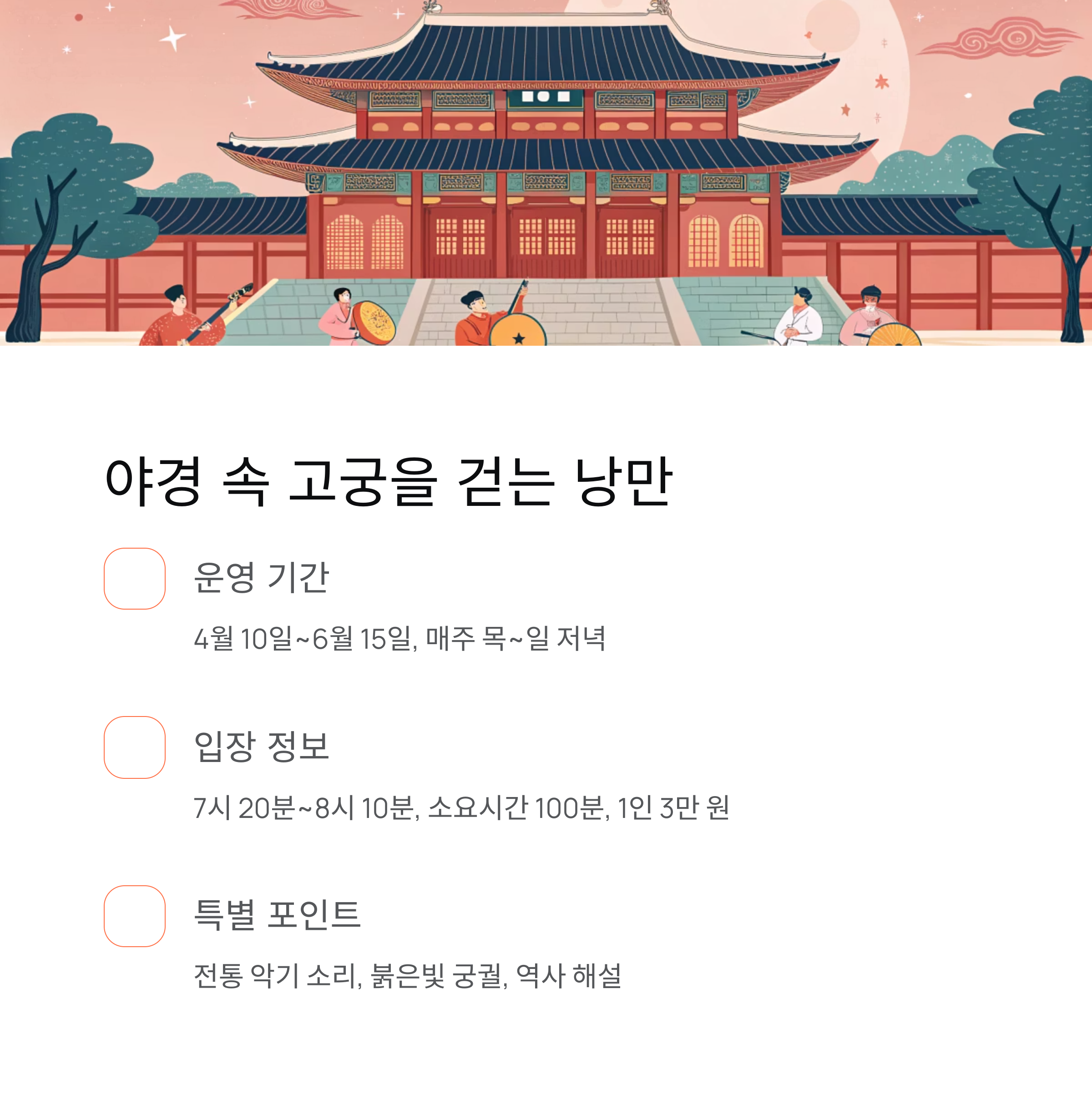 | 창덕궁 달빛기행 | 4.10~6.15 | 3만 원 | 야경·해설·공연 |