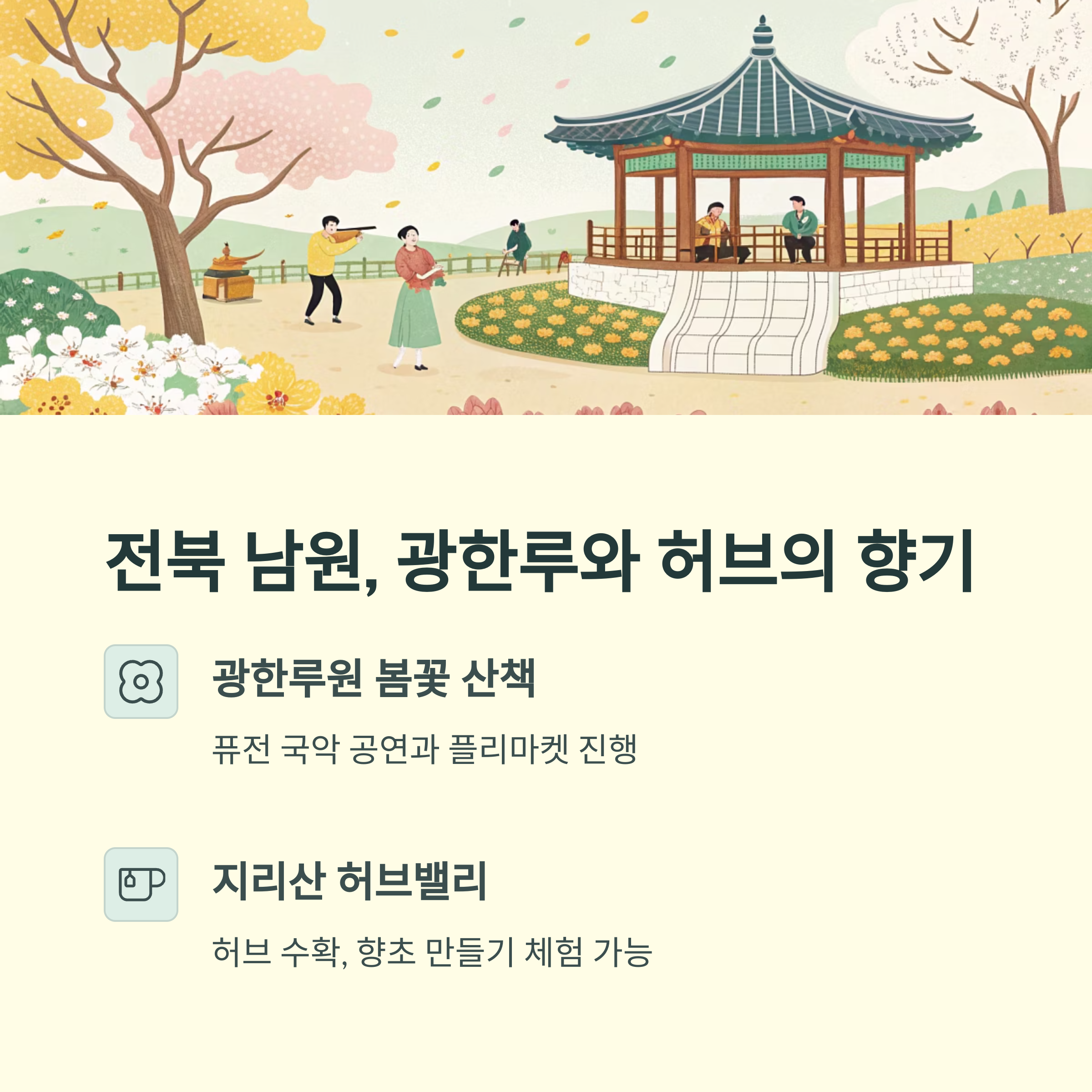 - 추천 산책 코스: 광한루 → 남원천 산책로 → 요천 벚꽃길