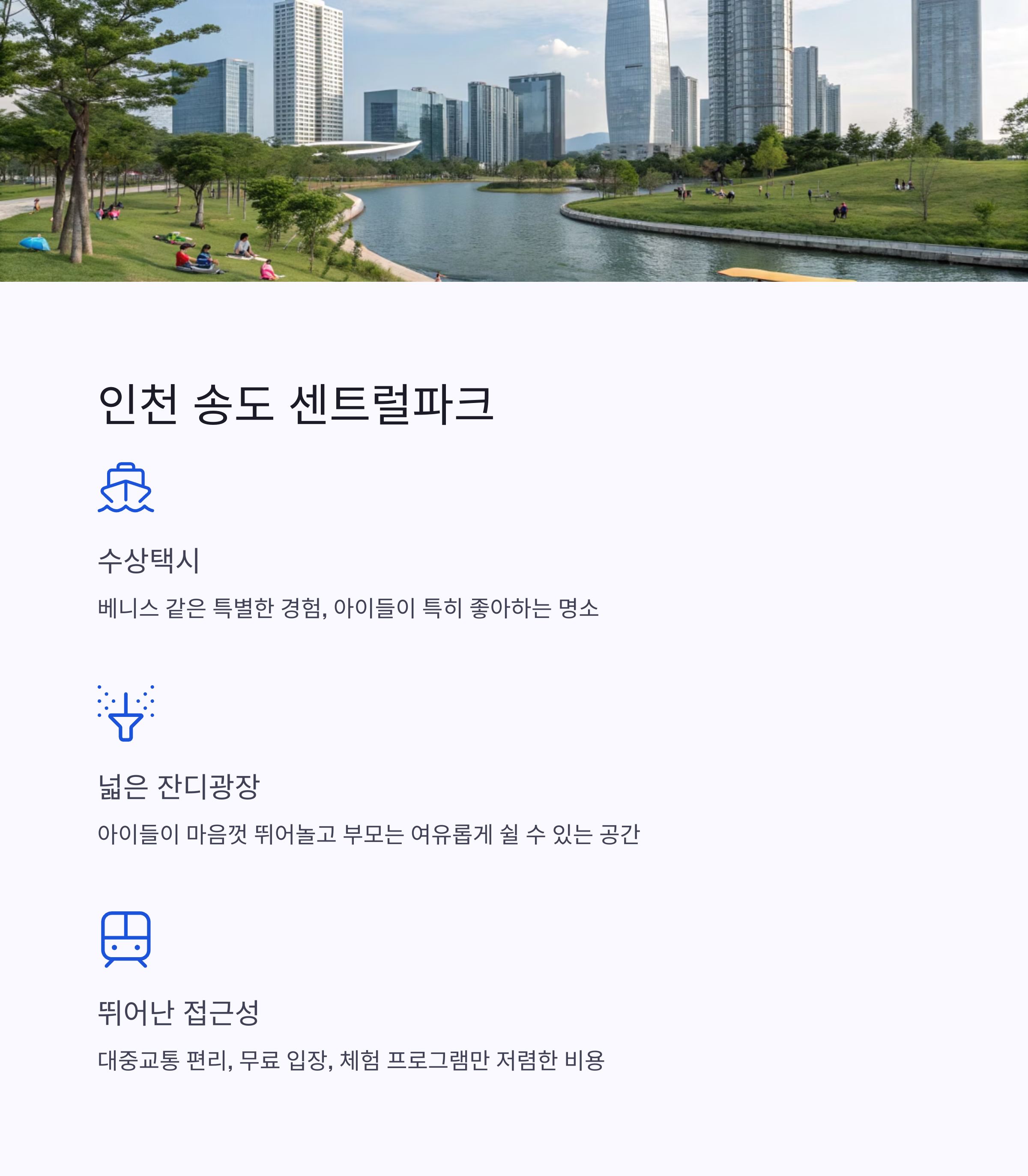 각 장소별로 특색이 뚜렷해서 아이들의 취향에 맞게 선택할 수 있다는 것도 좋습니다. 물놀이를 좋아하면 용오름계곡, 도시적인 분위기를 원하면 송도 센트럴파크, 동물을 좋아하면 인천대공원으로 가시면 됩니다.