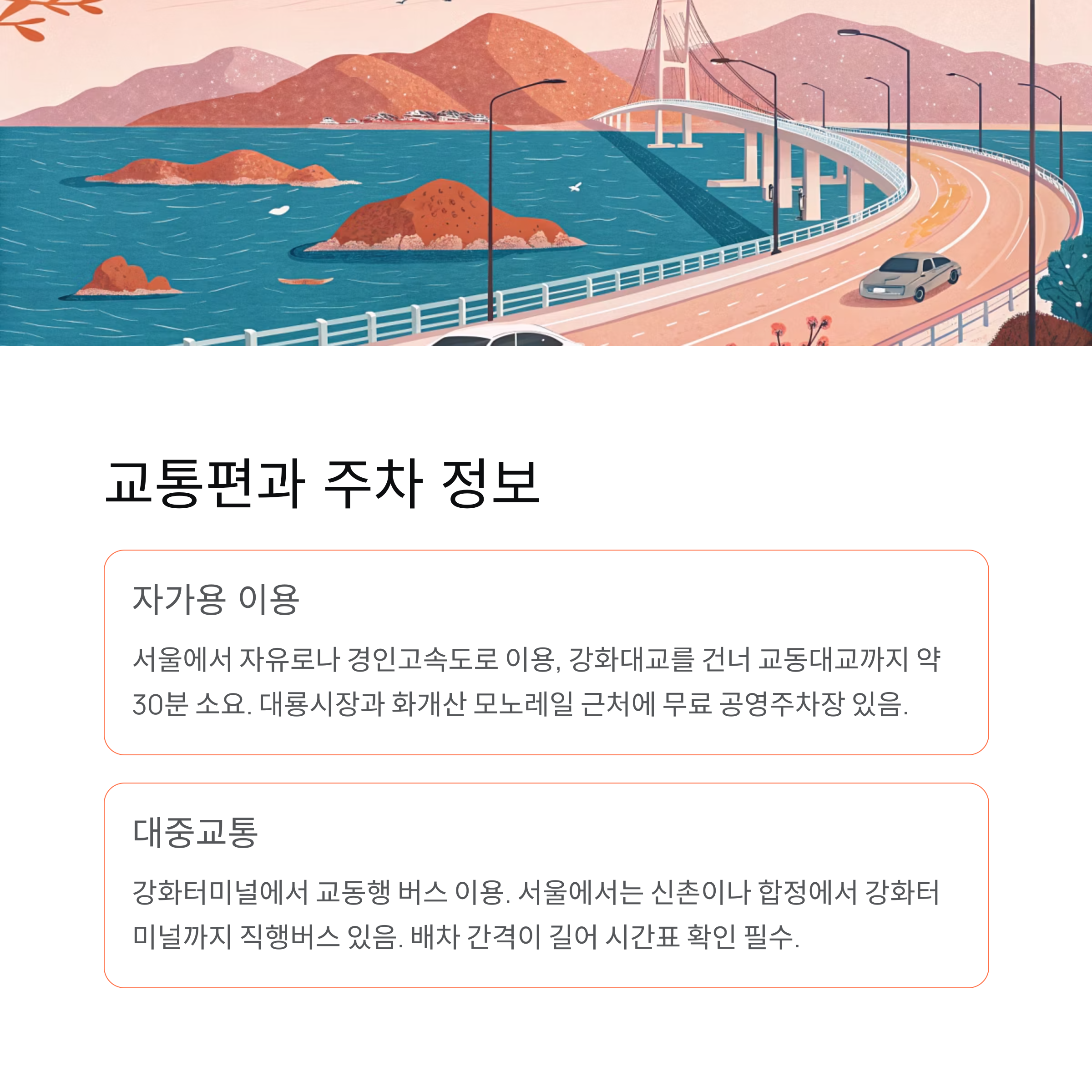 강화터미널에서 교동행 버스는 하루에 몇 차례만 운행되니까 시간표를 미리 확인하시는 게 중요해요. 배차 간격이 길어서 놓치면 오래 기다려야 할 수 있거든요.