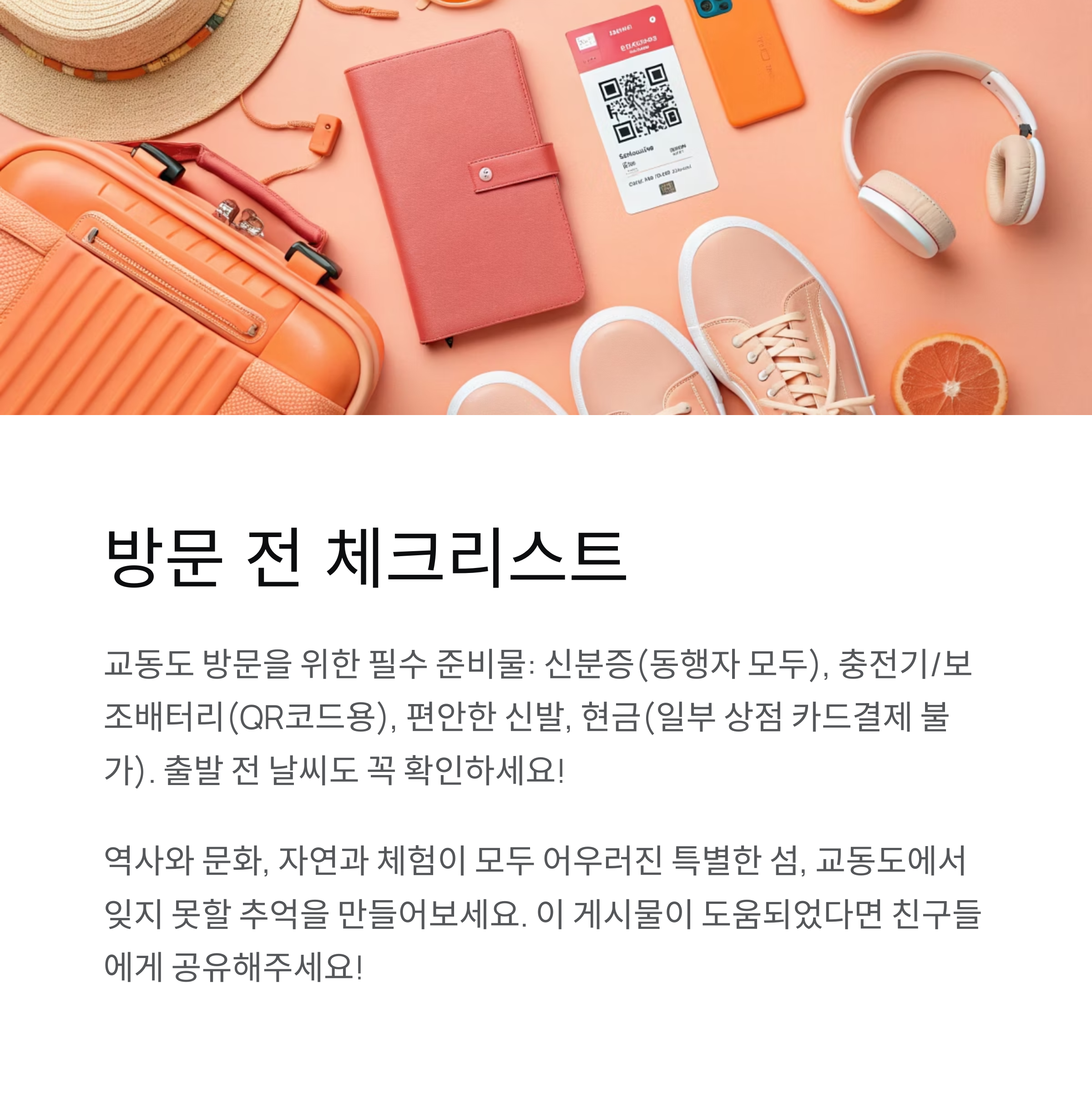 교동도는 하루 여행지로 정말 완벽한 곳이에요. 역사와 문화, 자연과 체험이 모두 어우러진 특별한 섬에서 잊지 못할 추억을 만들어보세요!
