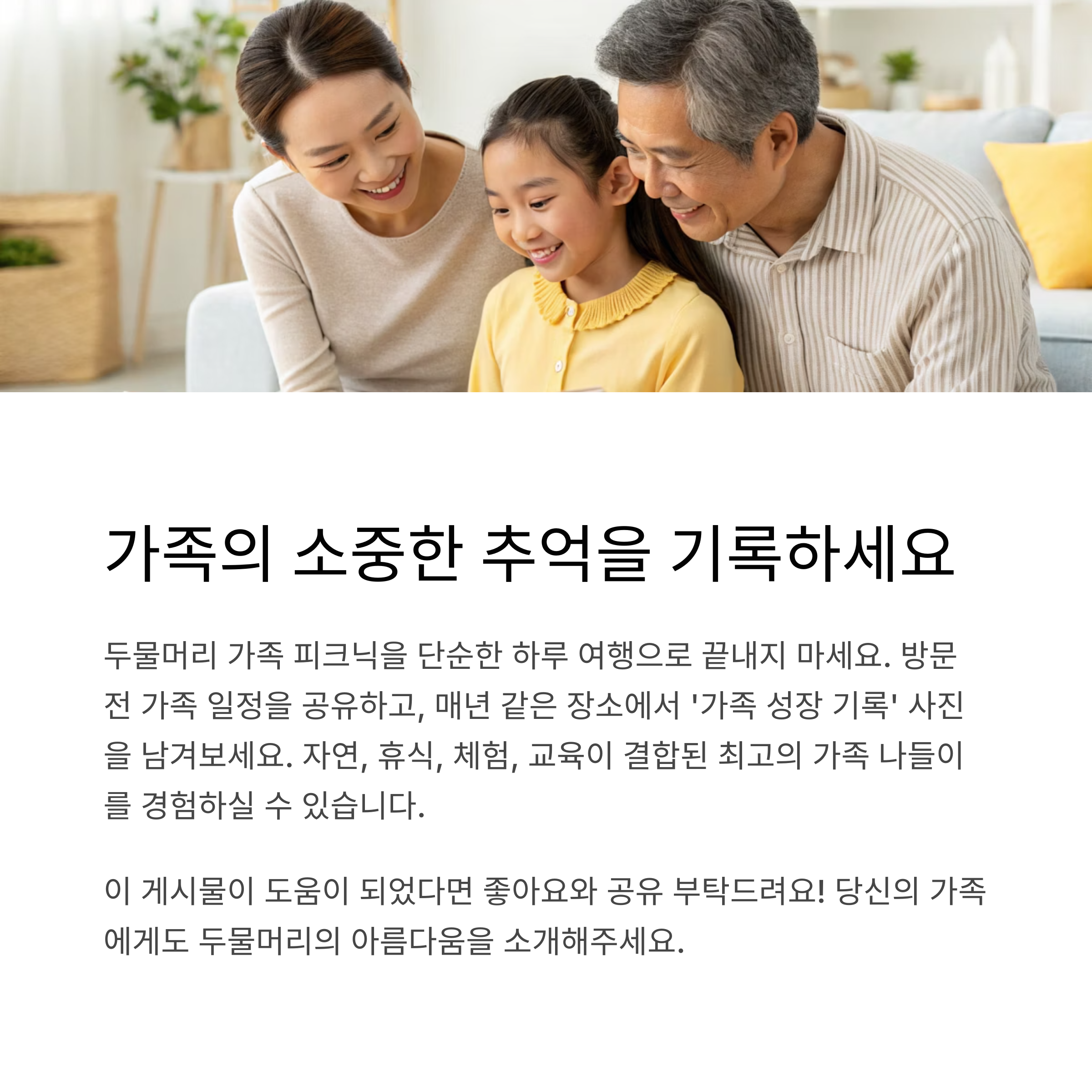 두물머리 가족 피크닉은 자연, 휴식, 체험, 교육이 결합된 최고의 가족 나들이 코스를 선사하며, 2025년 6월 가족 모두의 소중한 추억을 남기기에 더할 나위 없는 선택지임을 확신할 수 있습니다.