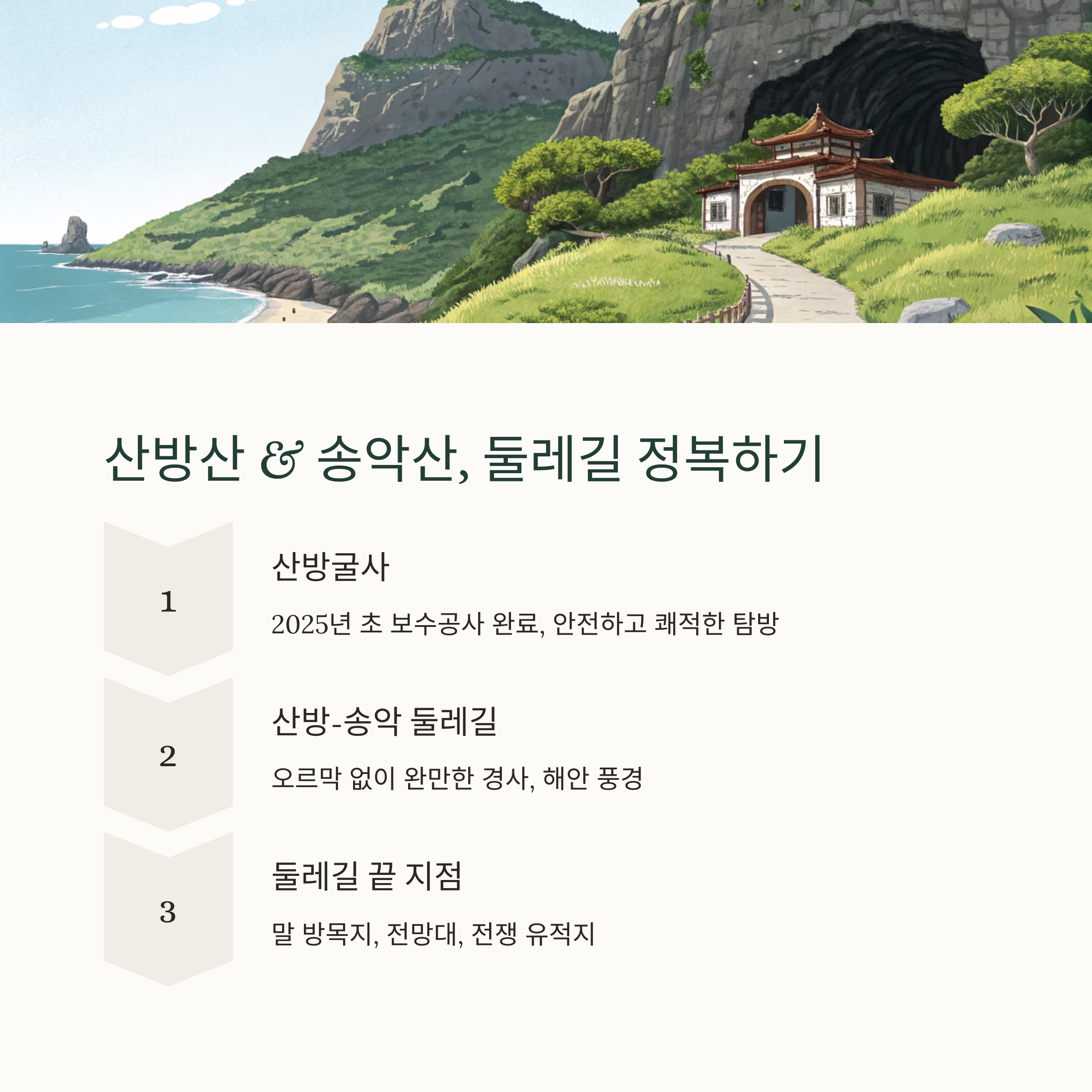| 산방굴사 입구 → 송악산 둘레길 | 오르막 없이 완만한 경사, 해안 풍경 |