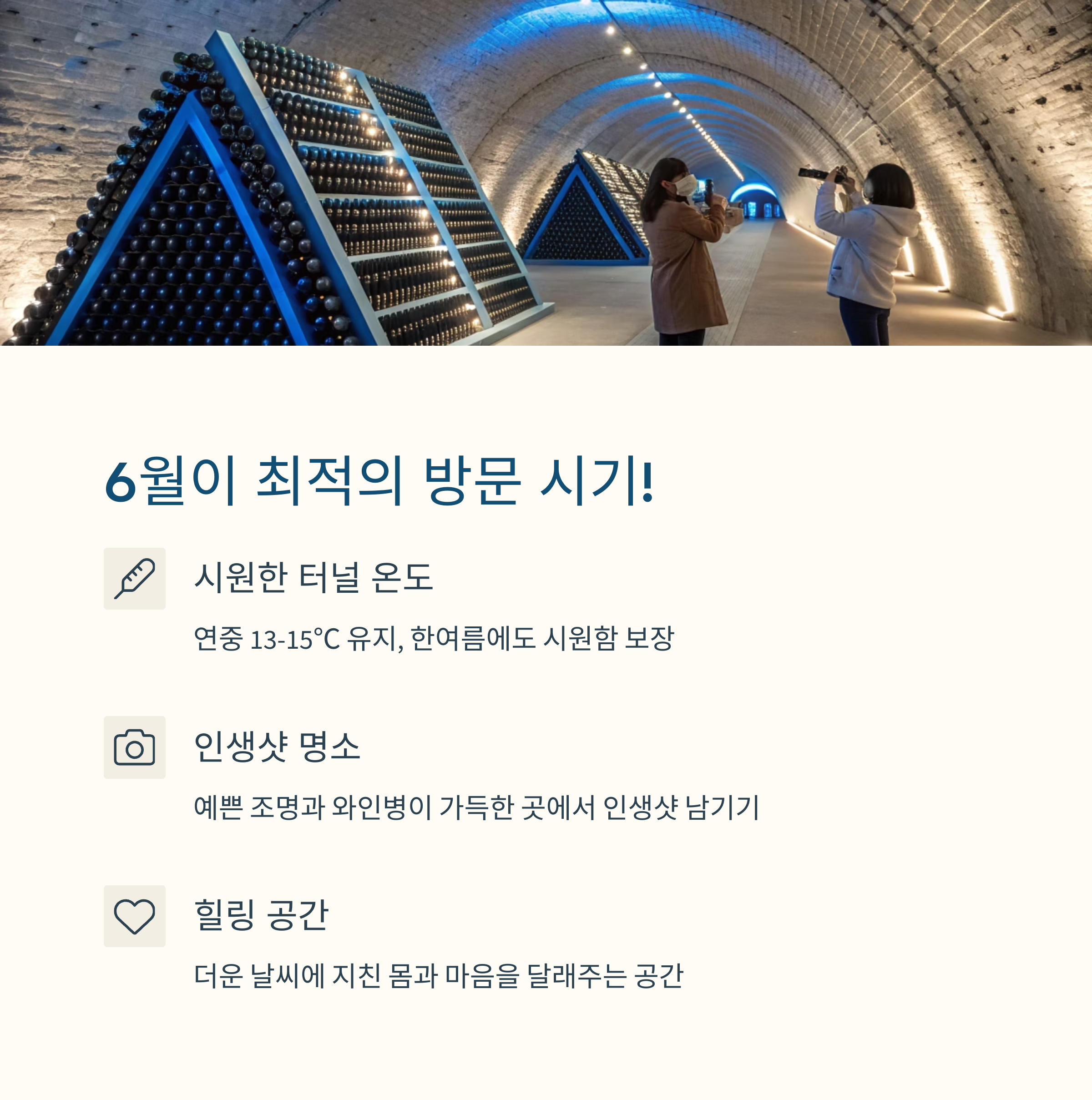 6월 국내여행을 계획하고 계신가요? 탁 트인 자연 속에서 맛있는 와인과 함께 특별한 추억을 만들고 싶다면, 청도 와인터널이 정답입니다! 시원한 터널 안에서 즐기는 다채로운 체험과 함께, 잊지 못할 인생샷까지 남길 수 있는 이곳으로 떠나볼까요?