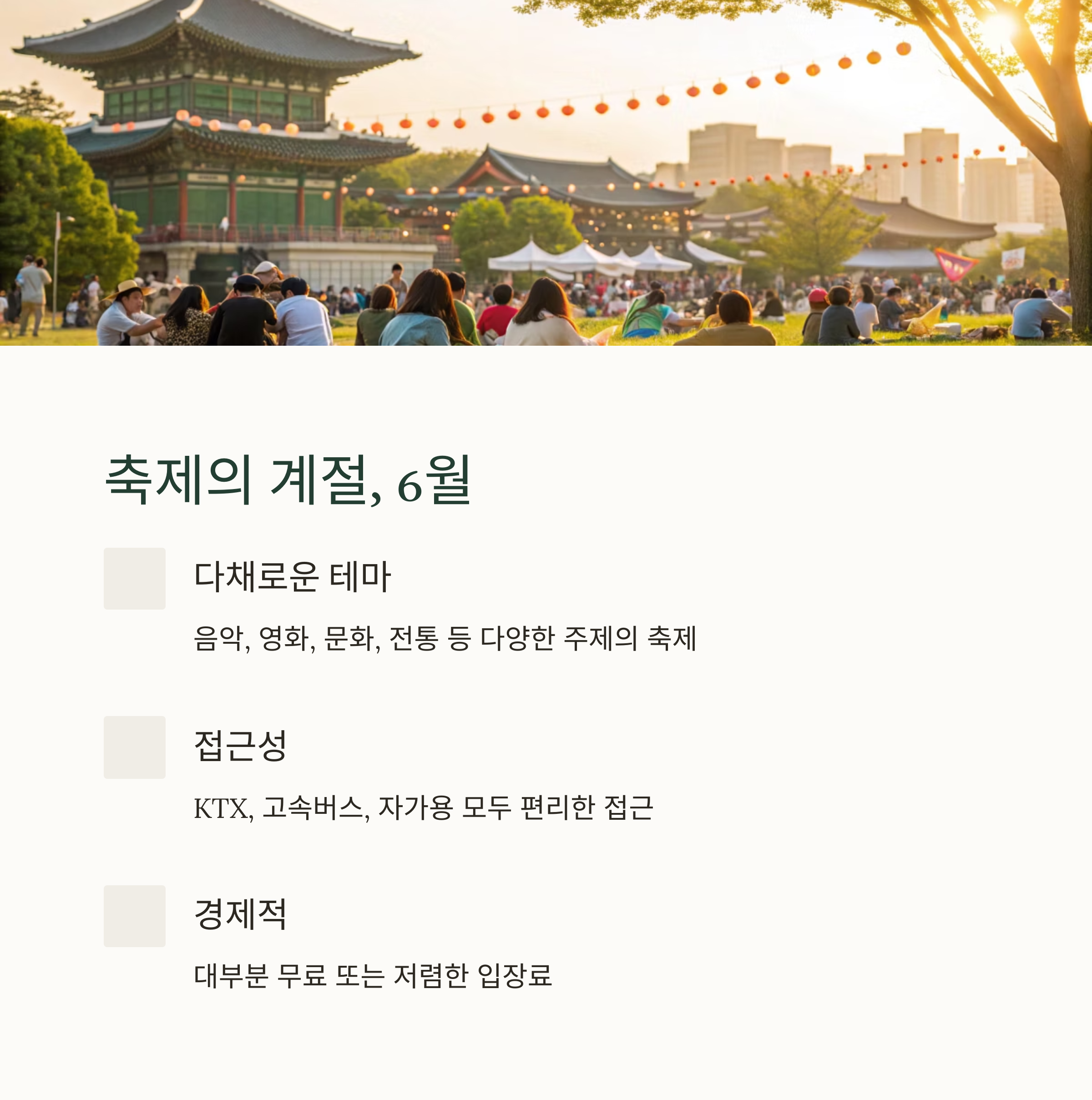 2025년 6월, 전국 곳곳에서 열리는 풍성한 축제를 총정리했습니다. 남이섬부터 부산까지, 테마별 즐길 거리와 꿀팁까지 지금 확인해 보세요!
