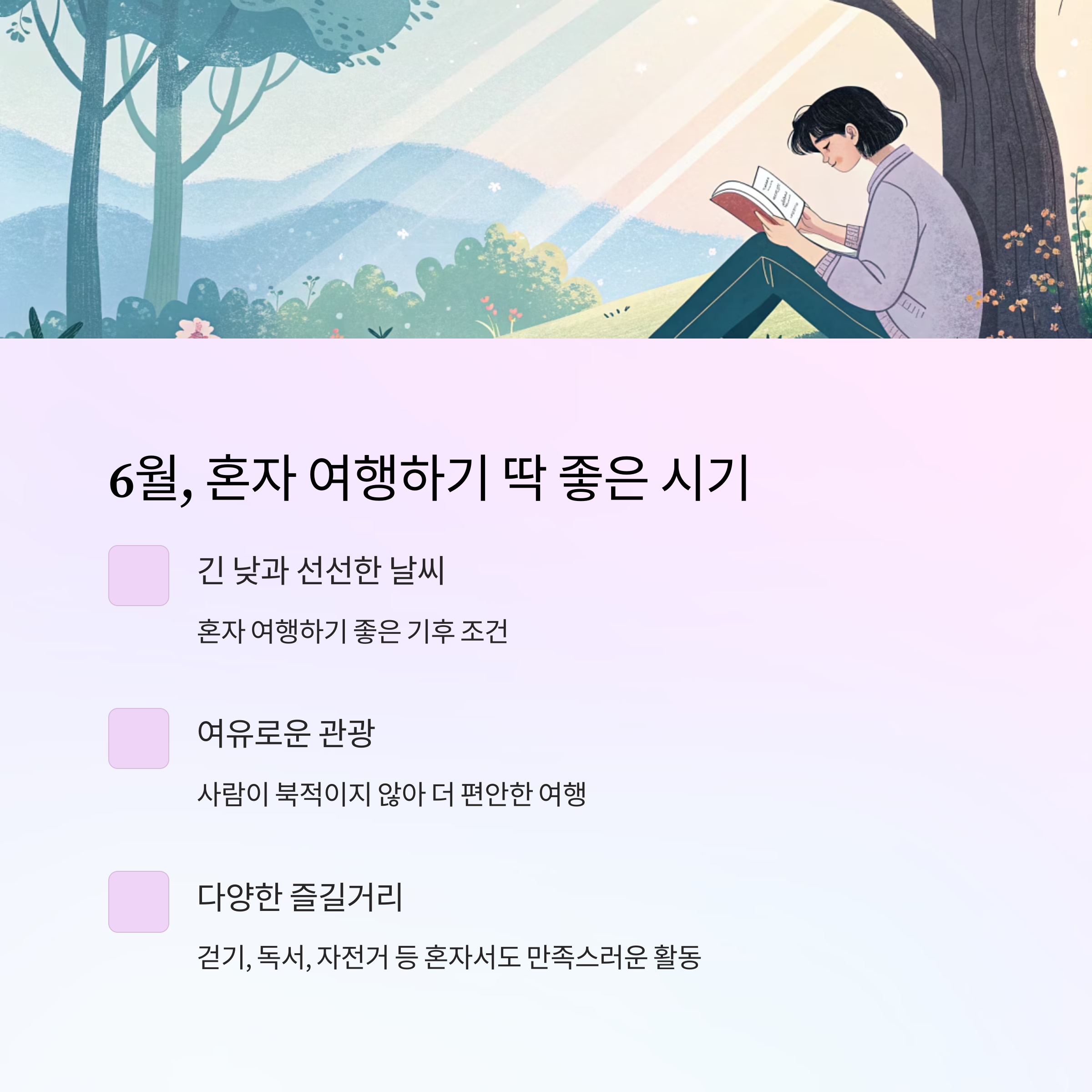 6월은 낮이 길고 날씨가 선선해서 혼자 여행하기 딱 좋은 시기입니다.